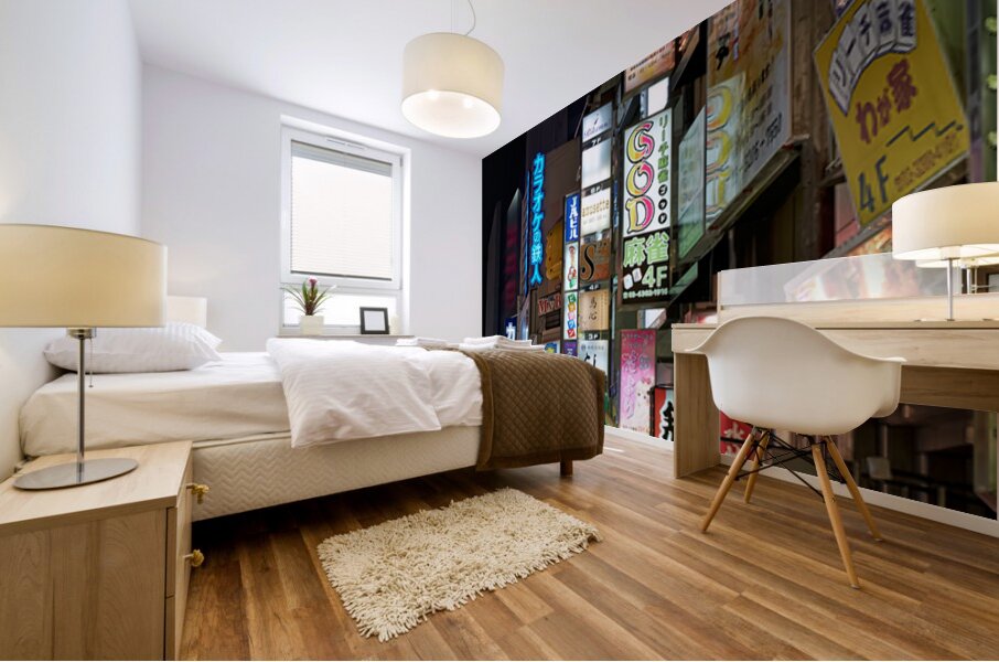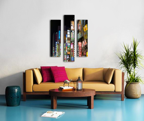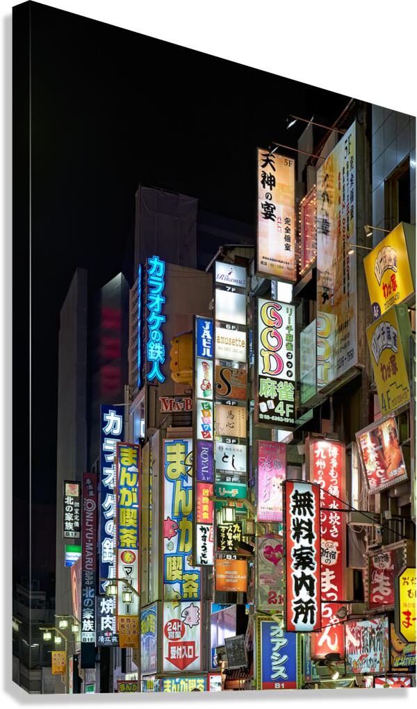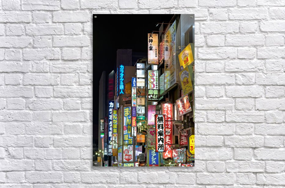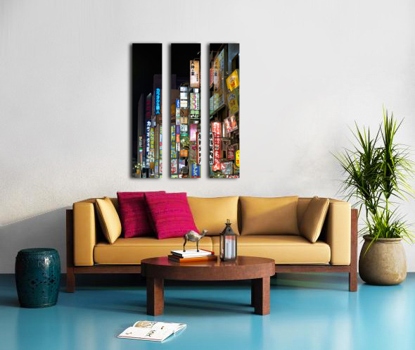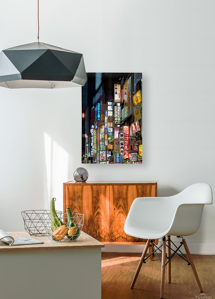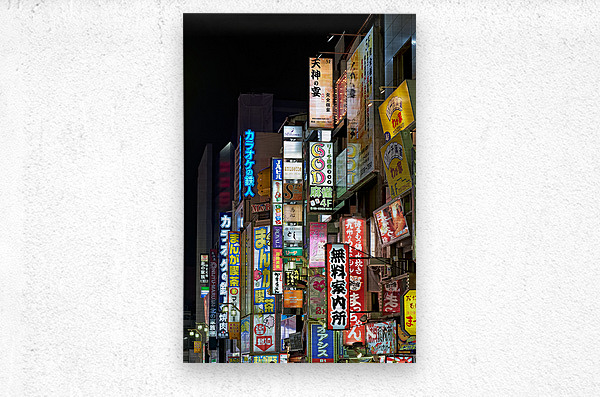 SUR CETTE OEUVRE: NEON LIGHTS ILLUMINATE SHINJUKU DISTRICT STREETS IN TOKYO AT NIG