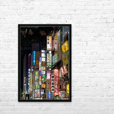 Pour obtenir "Neon lights illuminate Shinjuku district streets in Tokyo at nig" dans une impression encadrée.