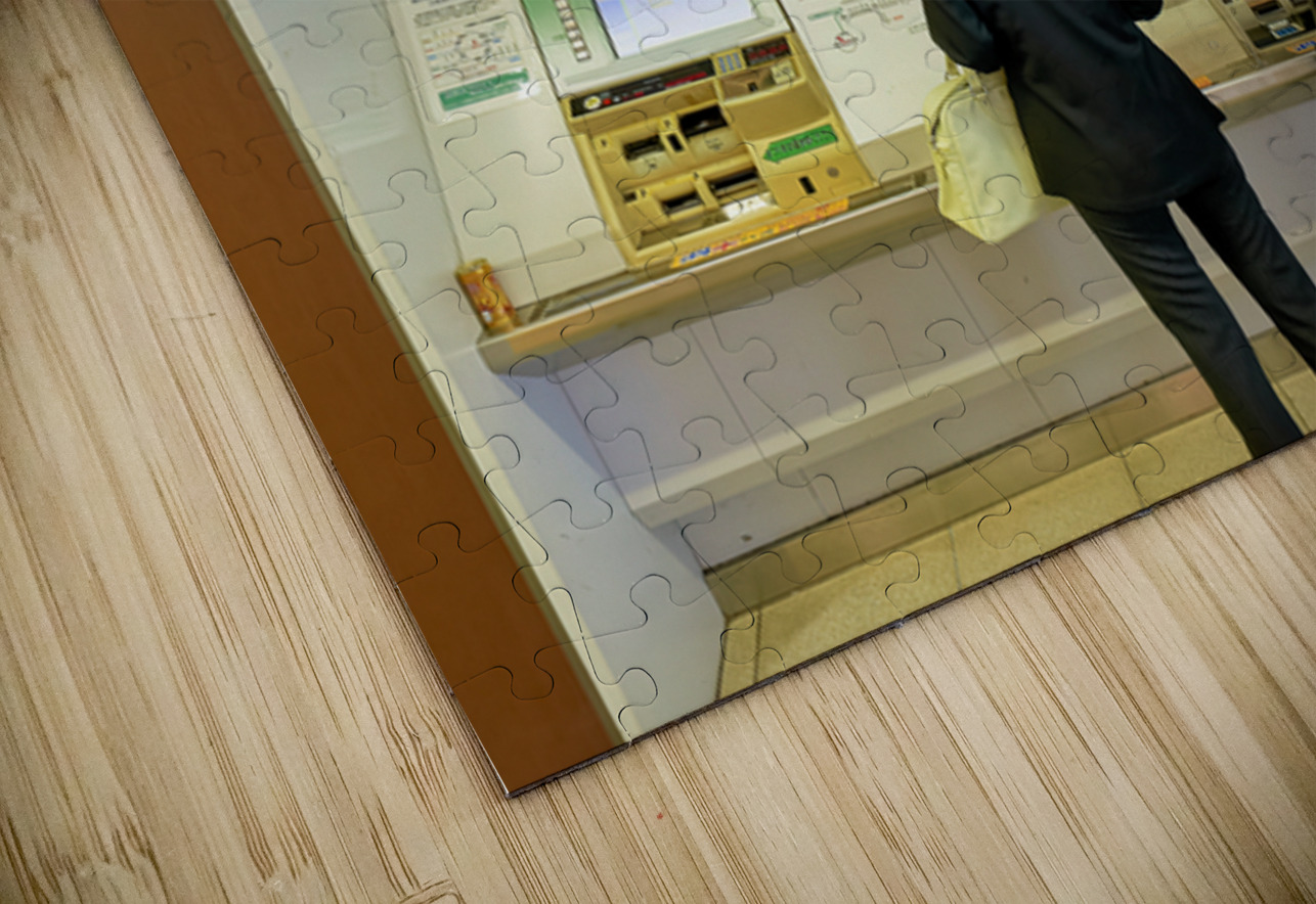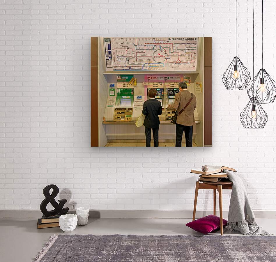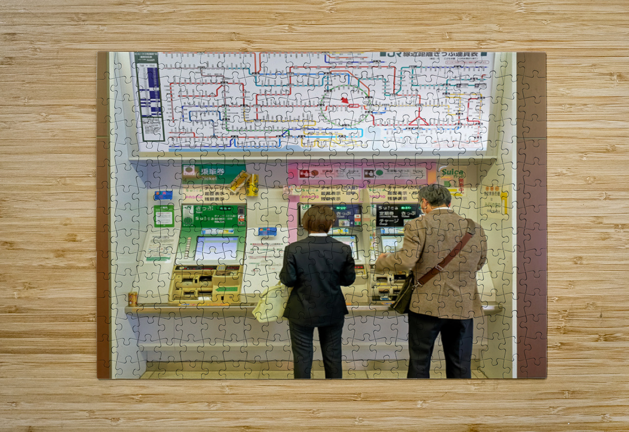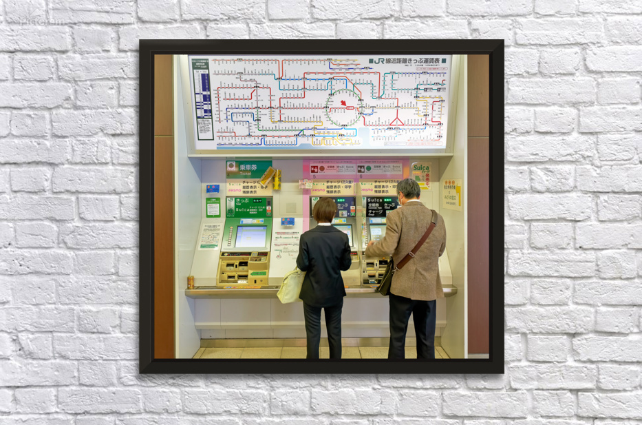 "Buying tickets at a metro station in Tokyo Japan during the day" dans une impression encadrée.