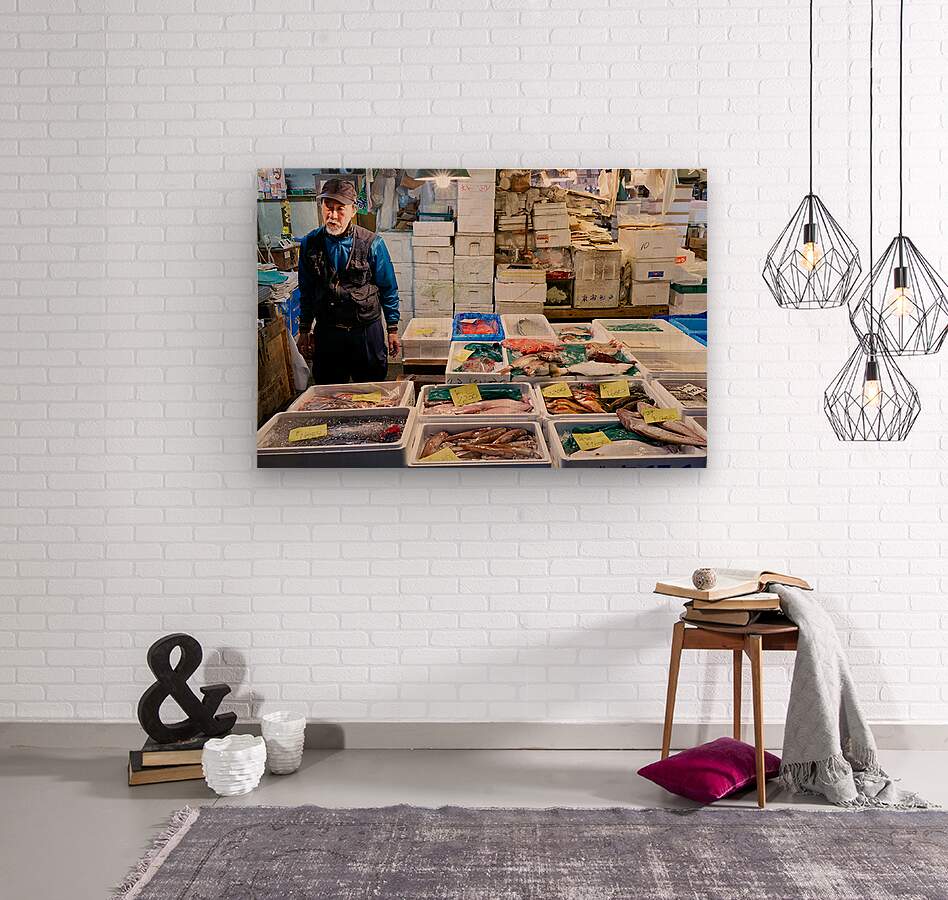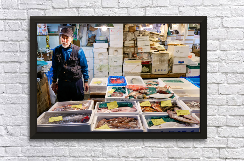 A seller stands next to many boxes of fish and seafood at the fish market in Tokyo. The market is busy with local shoppers looking for fresh catch.