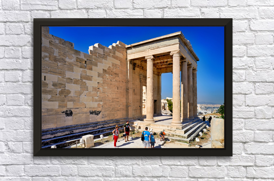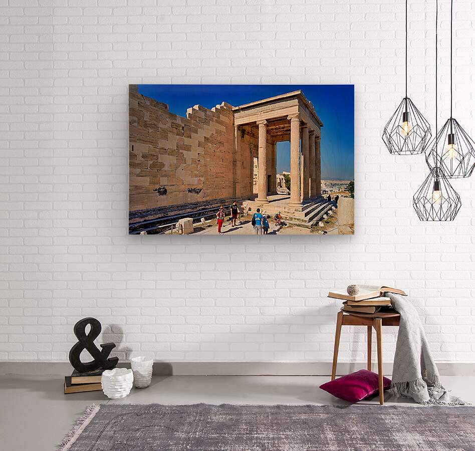 Visitors explore the Erechtheion temple located on the Acropolis in Athens. Tourists observe the historic structure under clear skies.