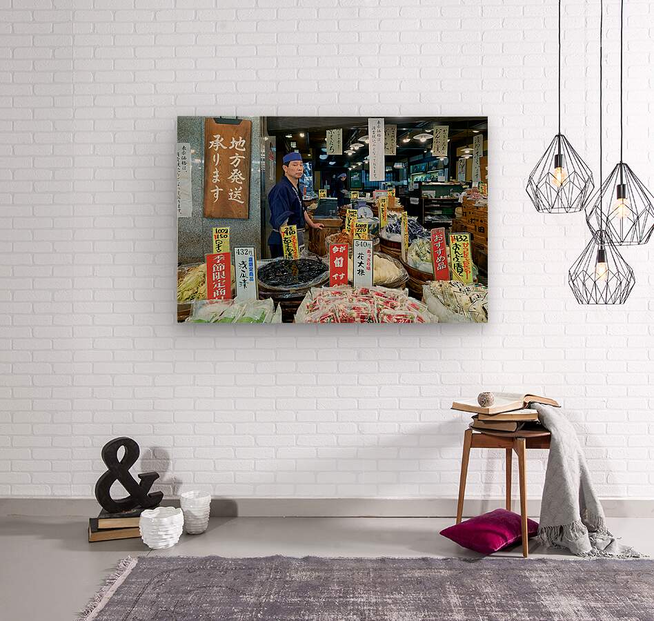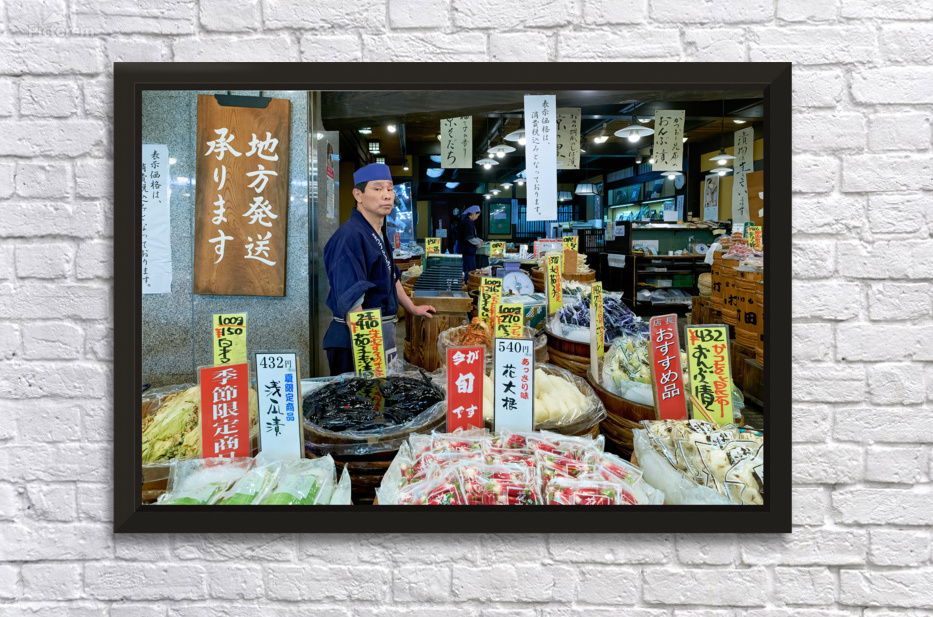 A vendor stands among various food items in Nishiki Market Kyoto Japan. Customers browse the colorful displays of goods available for purchase.
