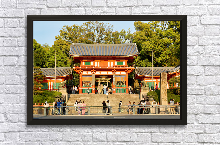 Many people are visiting Yasaka shrine temple in Kyoto Japan during bright daylight. Trees surround the temple and steps.