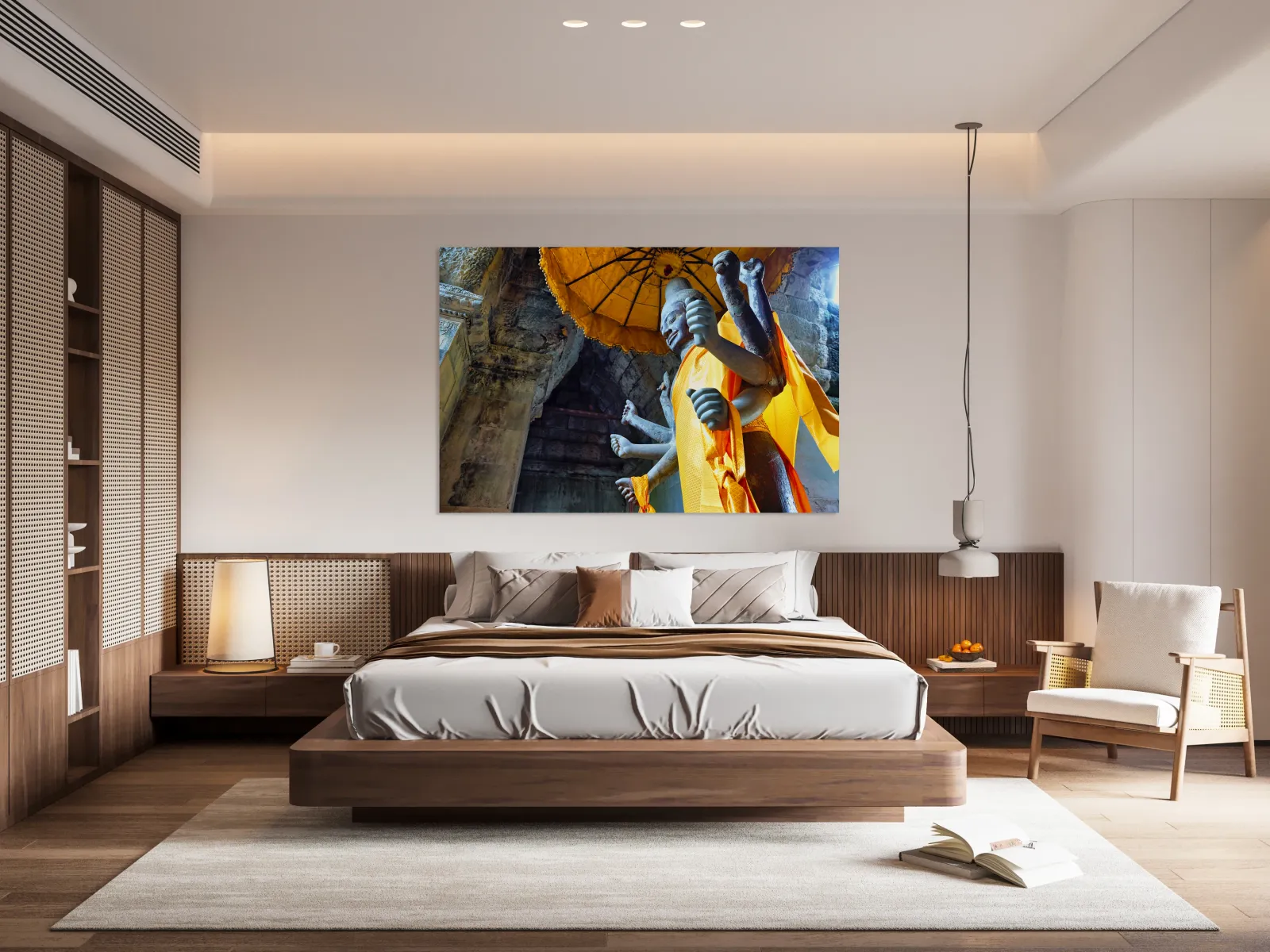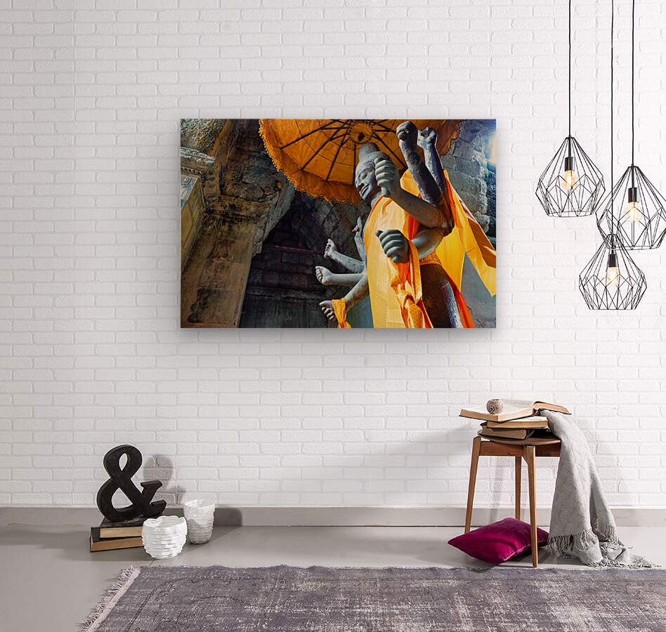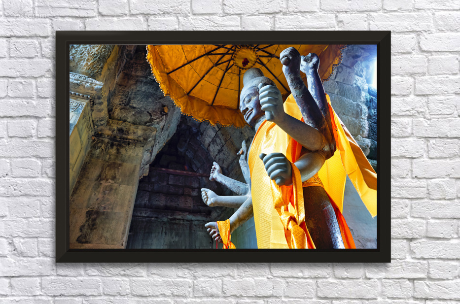 "Ancient multi armed statue yellow fabric inside stone temple." dans une impression encadrée.