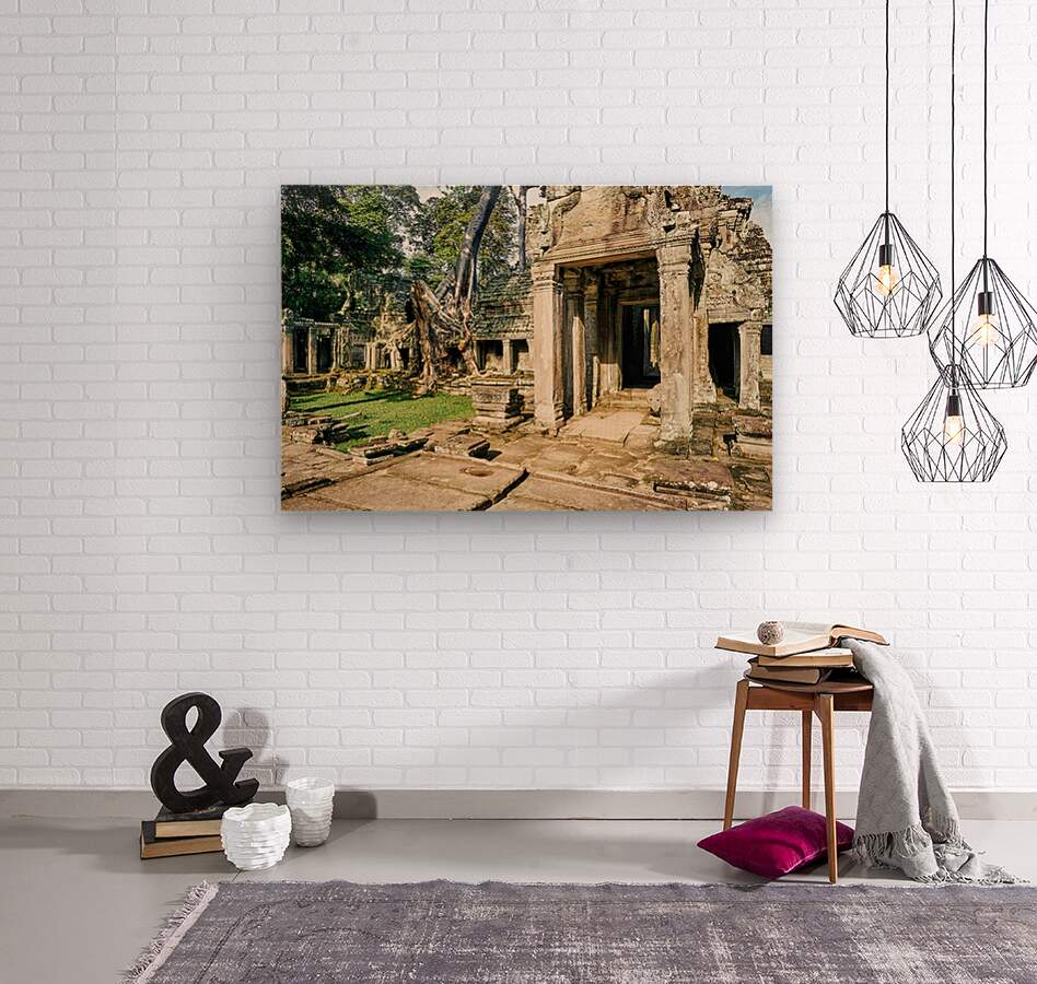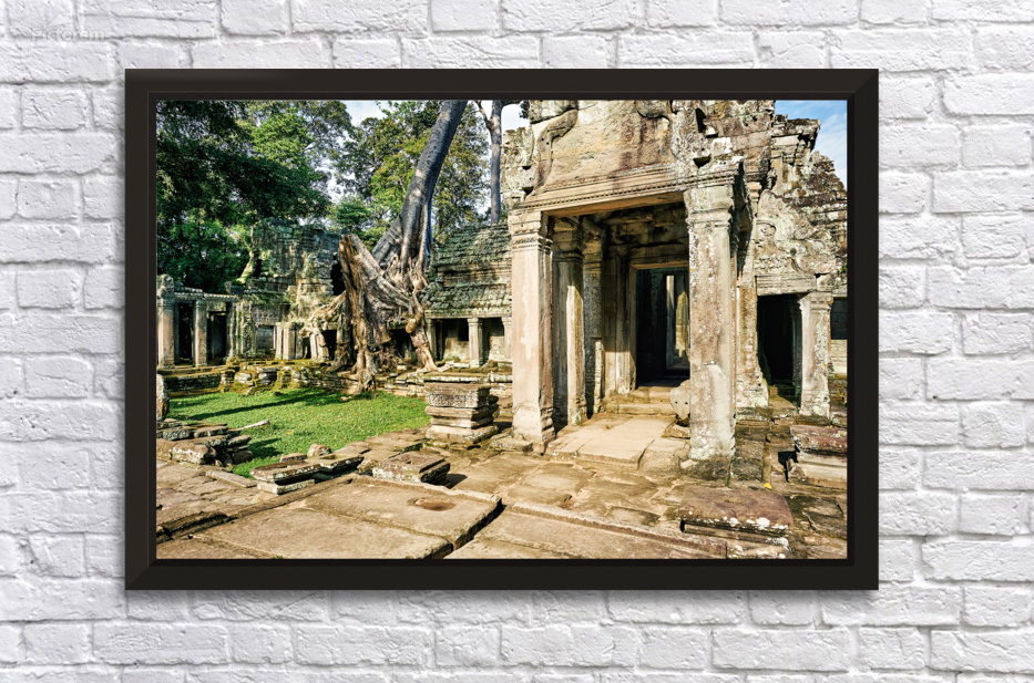 Nature reclaims ancient Khmer temple ruins in Angkor Cambodia where massive tree roots embrace stone structures a testament to time.