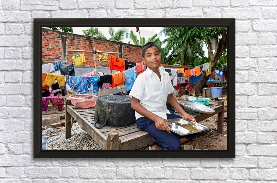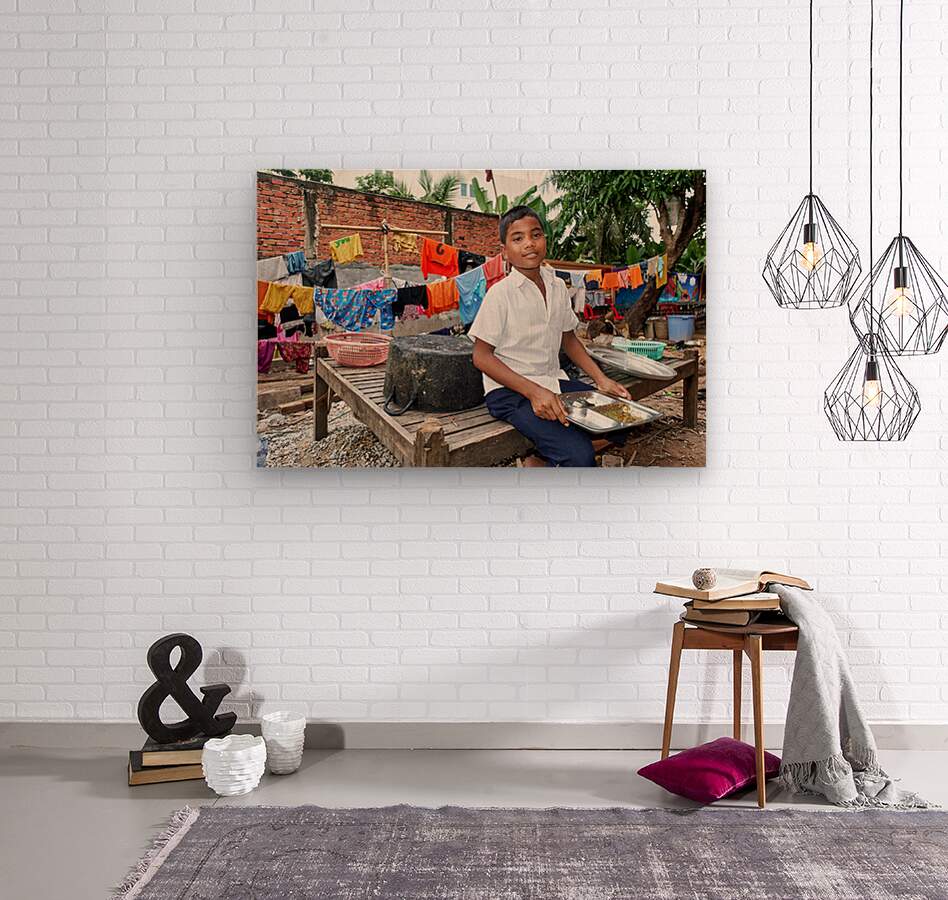 A young boy sits on a wooden platform eating a meal from a metal tray with colorful laundry drying on lines in the background of a residential area.