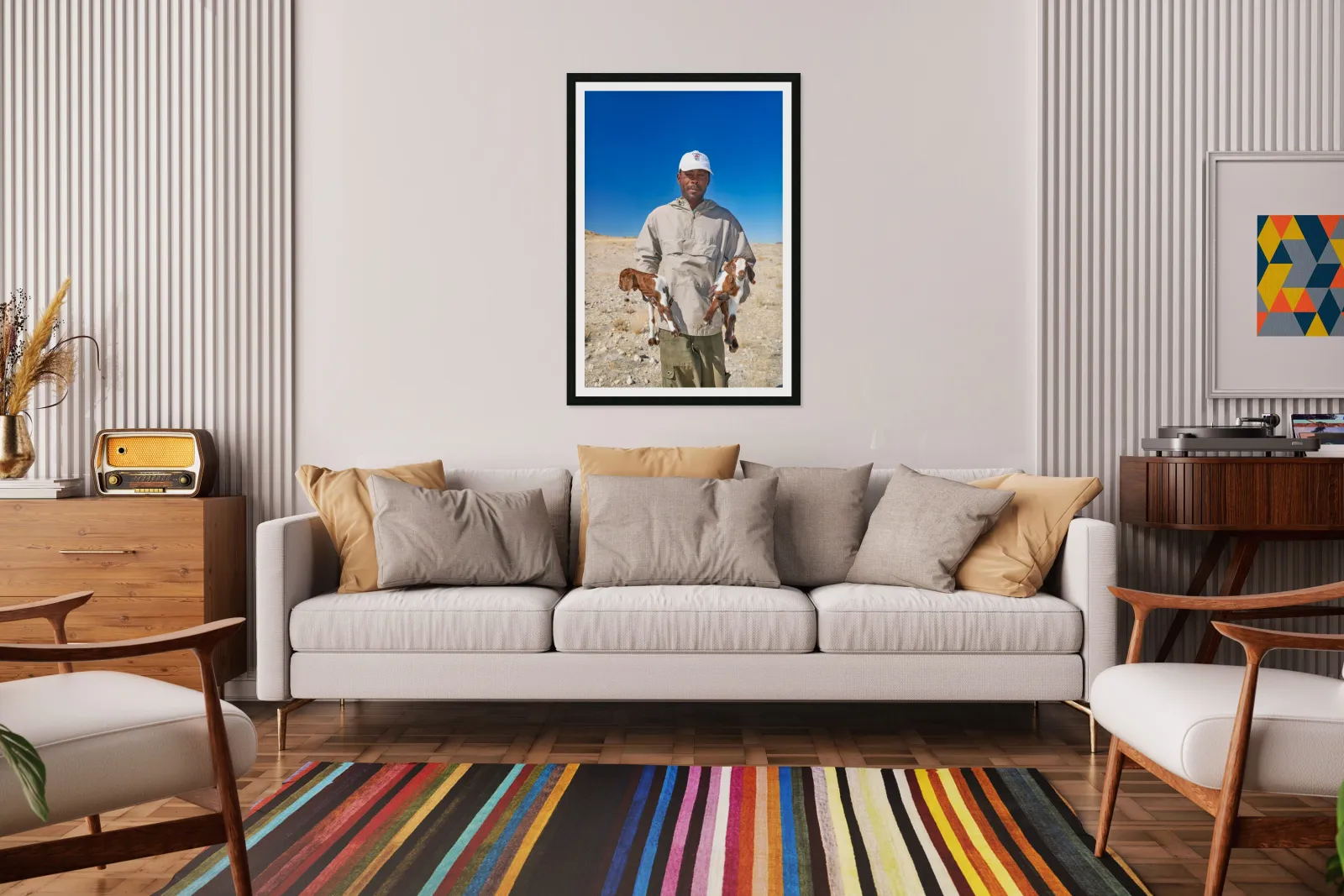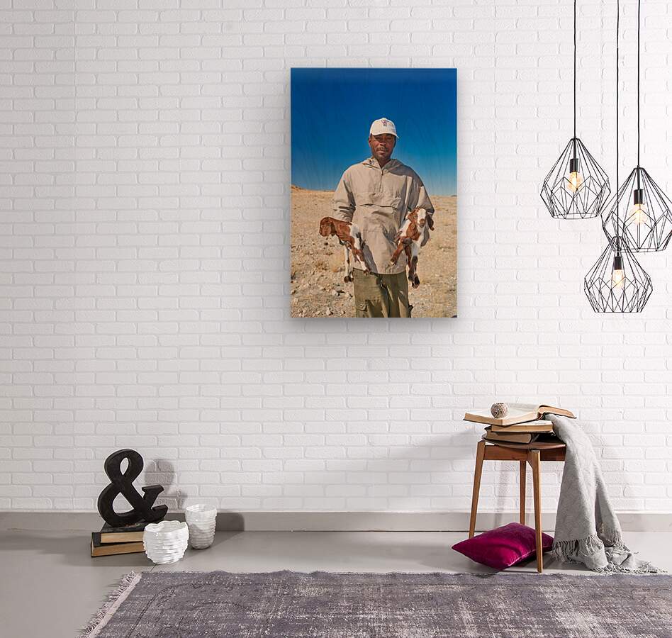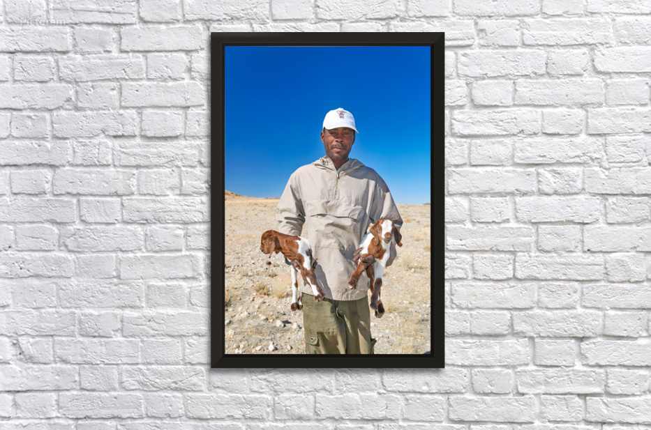A shepherd stands in Namibia holding two young goats. The landscape is dry with clear blue sky above.