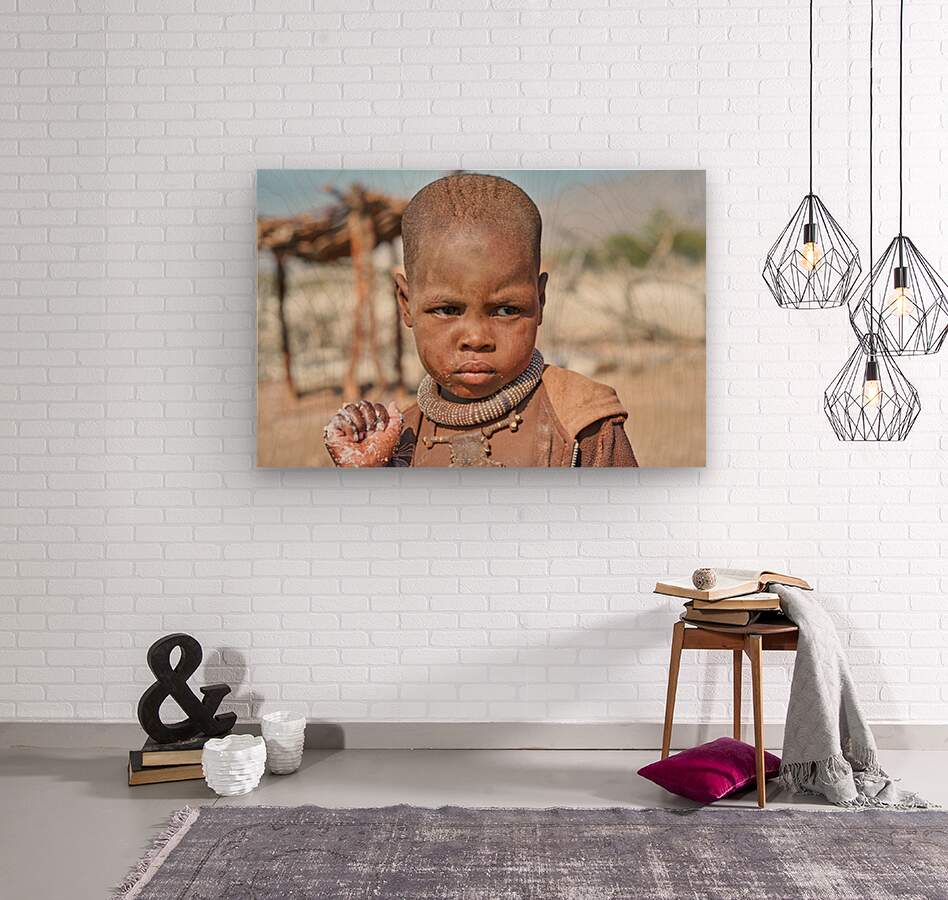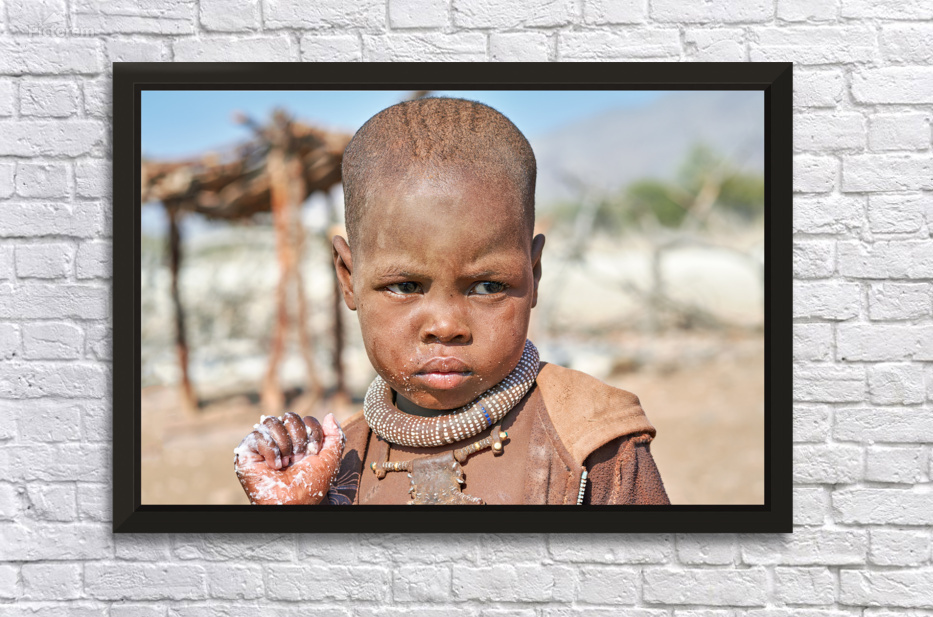 A child stands in front of a Himba village in the Kunene Region of Namibia. The child has a serious expression and is wearing traditional jewelry.