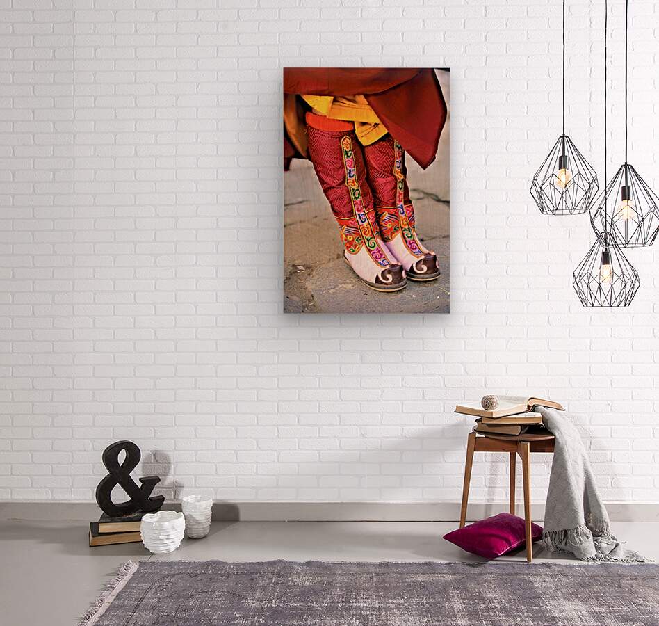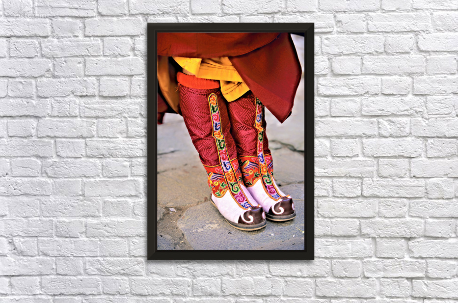 Intricate embroidered boots and traditional robes worn by a participant in a cultural ceremony or festival possibly in Bhutan or Tibet.