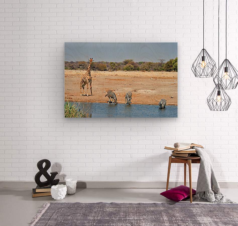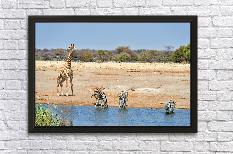 Giraffe stands nearby as zebras drink water from the waterhole in Etosha National Park Namibia on a sunny day with clear skies.