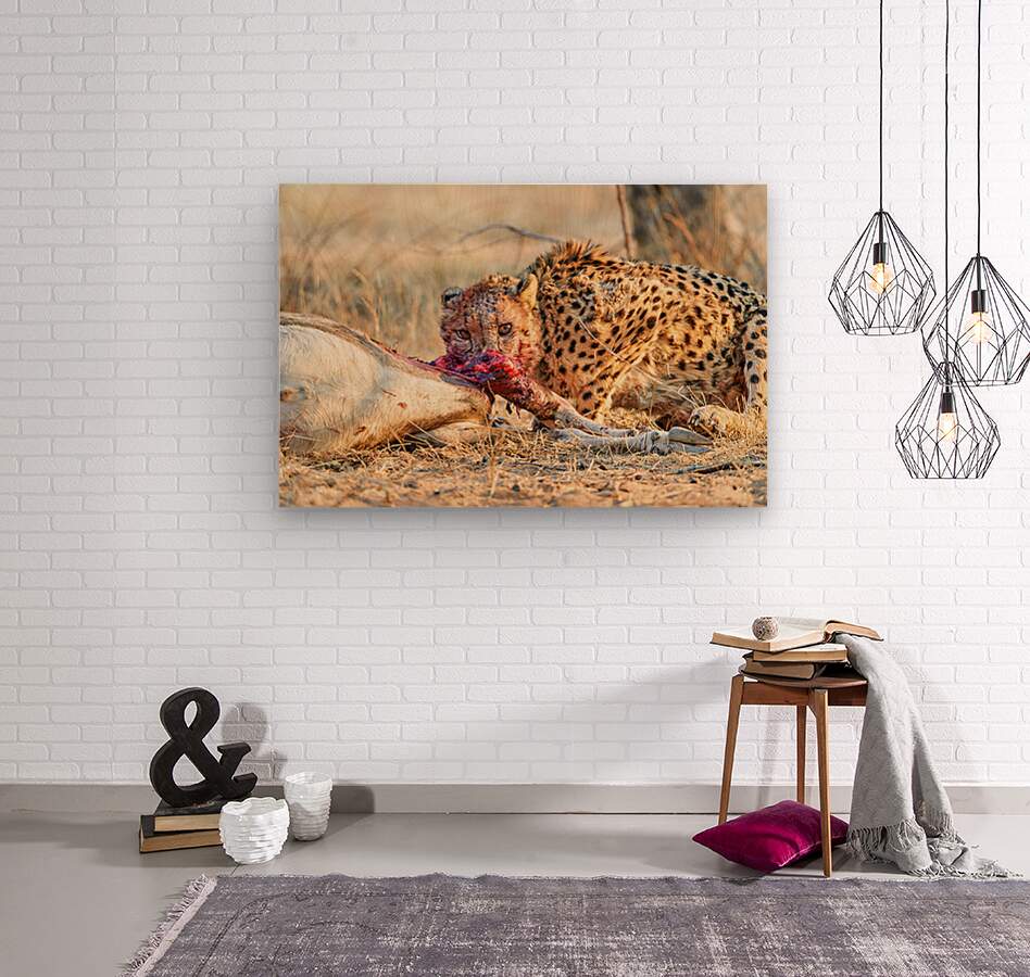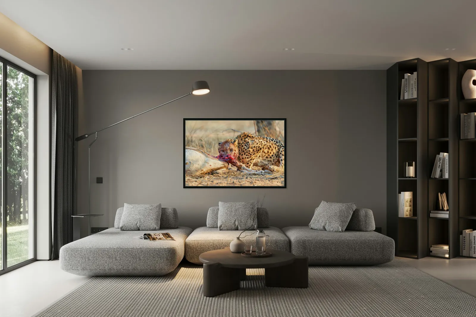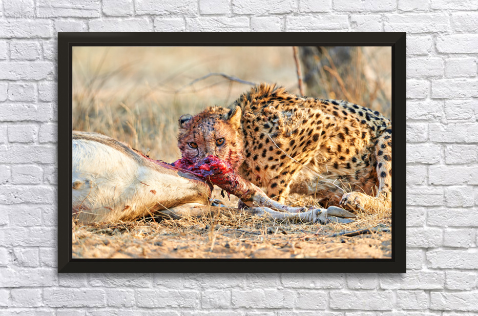 A cheetah is eating its catch after a successful hunt in Okonjima Reserve Namibia. The scene shows the animal focused on the meal.