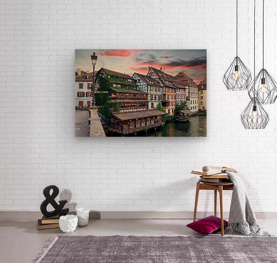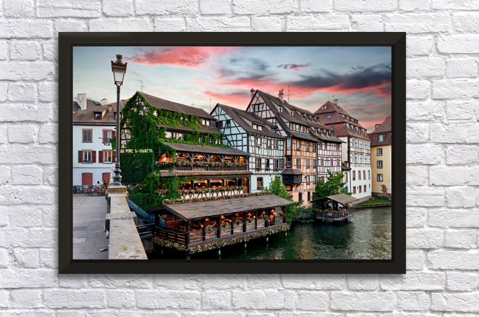 Timber framed houses stand by the waterway in Petit France Strasbourg. People eat dinner on the terrace while the sun sets.