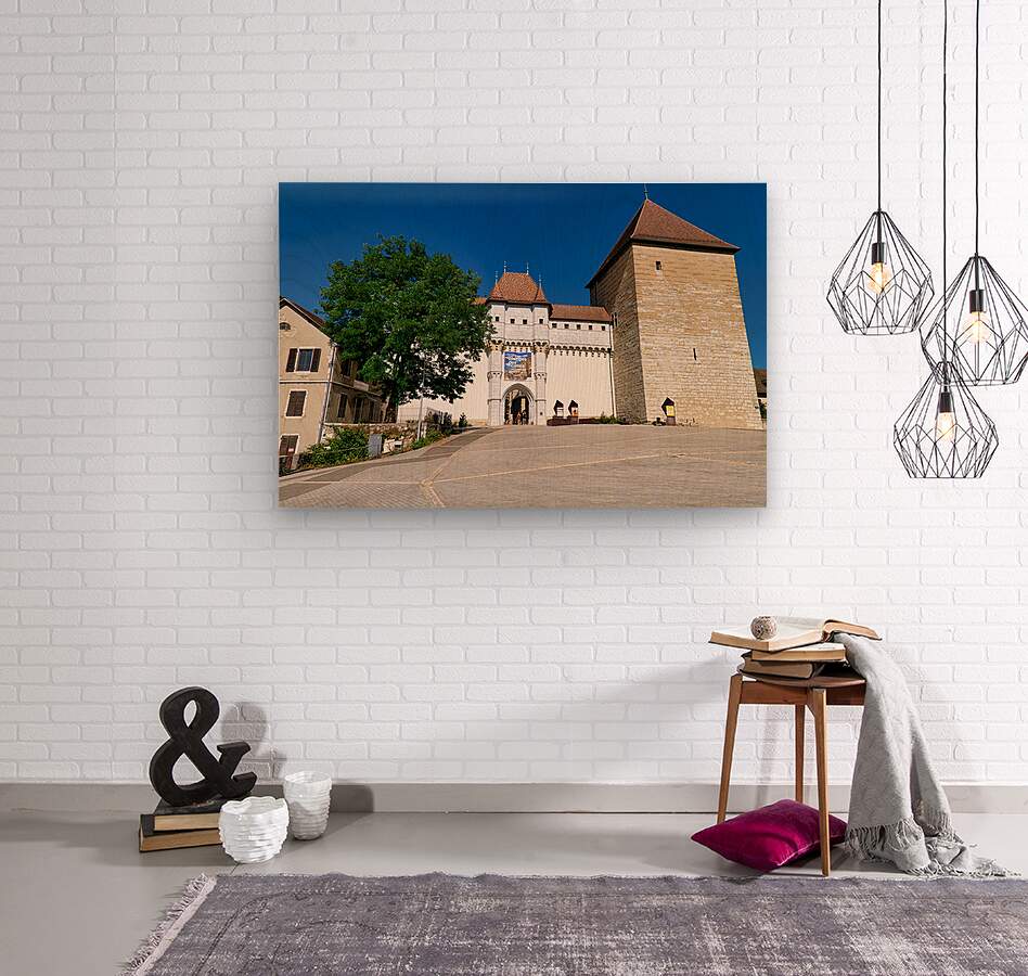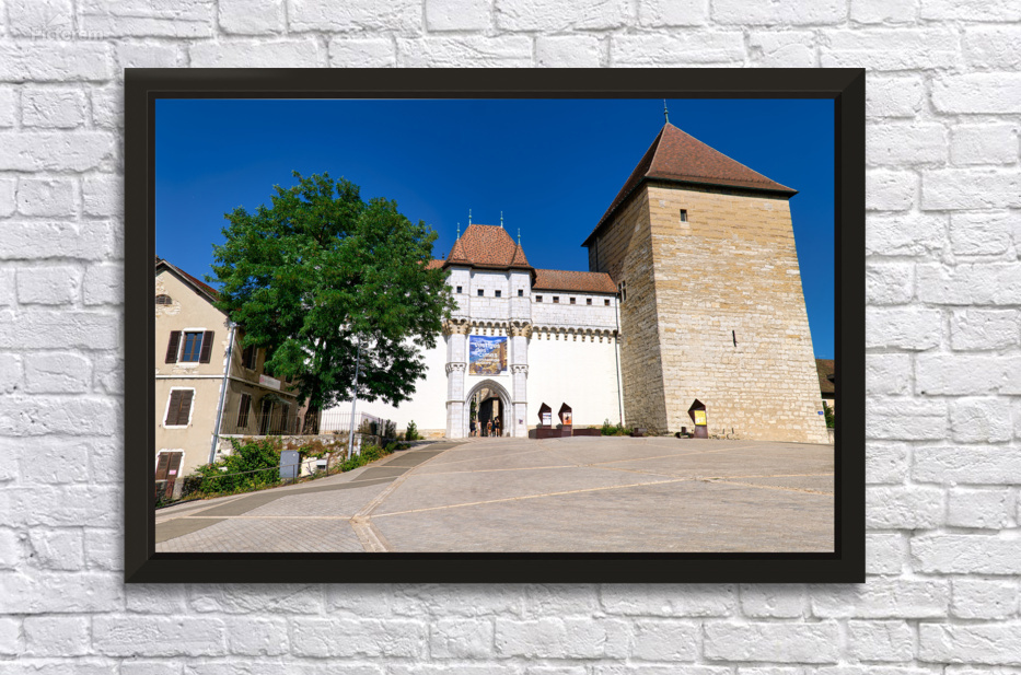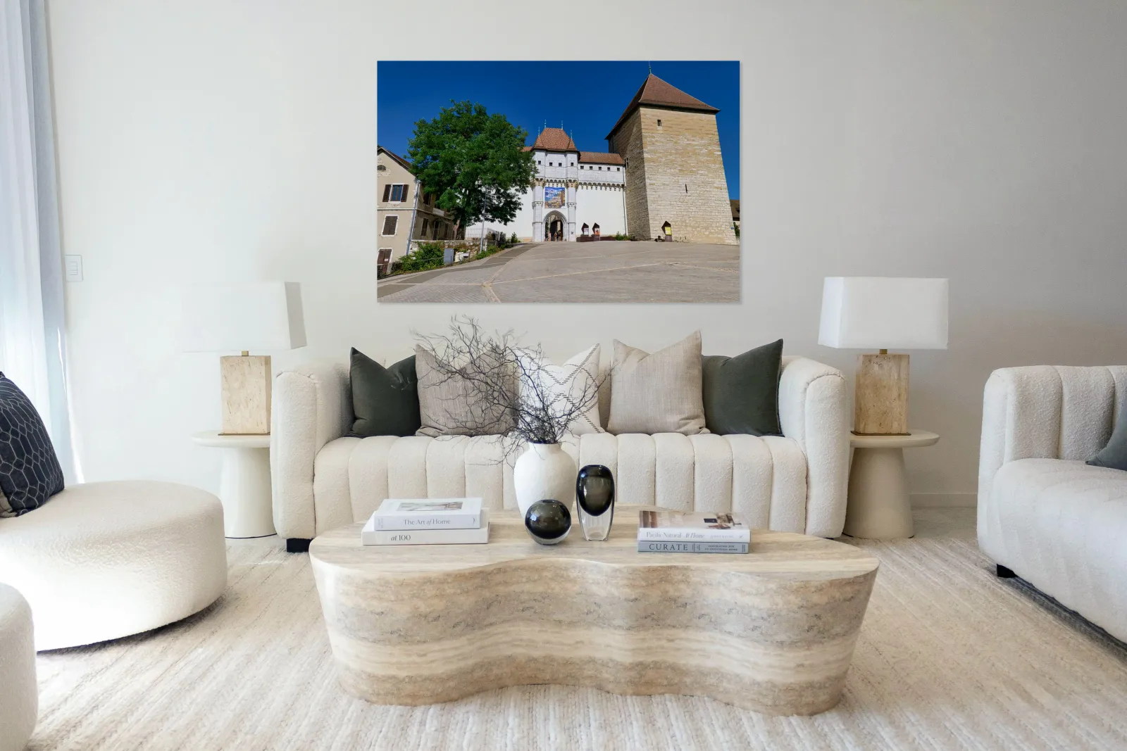 Tourists explore the castle in Annecy Haute Savoie France on a sunny day. The structure stands tall against a clear blue sky.