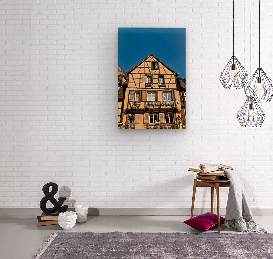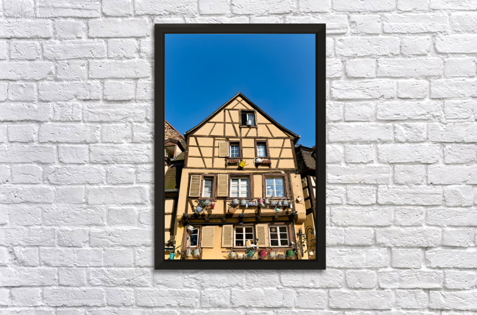 Timber framed houses stand tall in the old town of Colmar under a blue sky. This scene is located along the Alsace Wine Route.