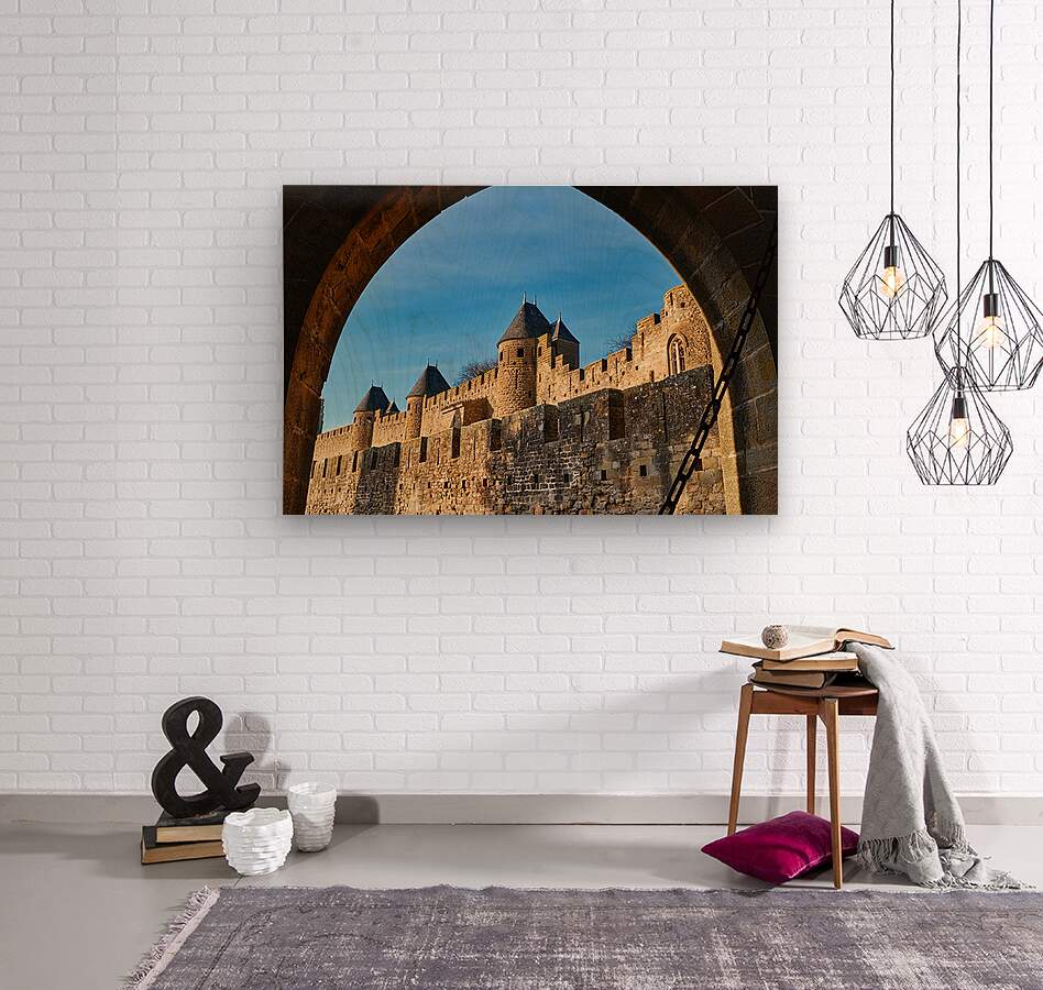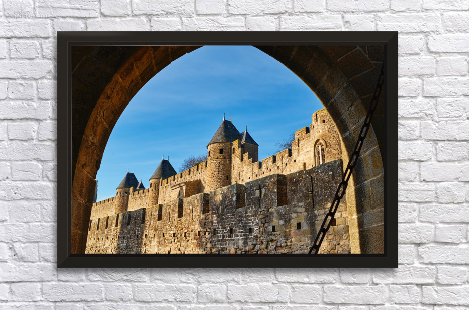 Visitors can see the strong stone walls and towers of Carcassonne. The scene shows the castle structure framed by an archway.
