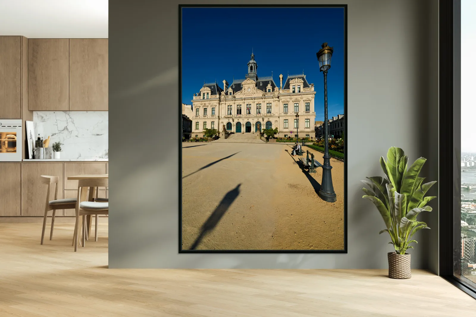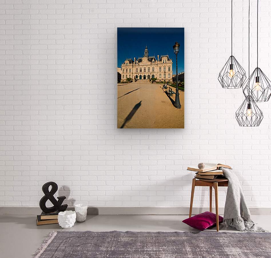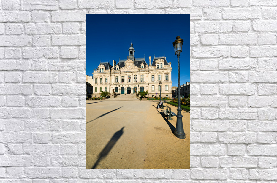 Vannes town hall is seen in the square under a blue sky. People walk nearby and shadows from street lamps appear on the ground.