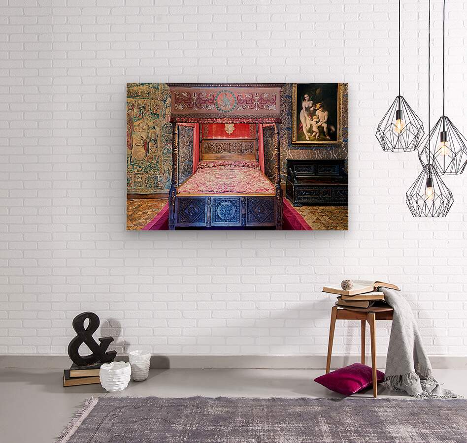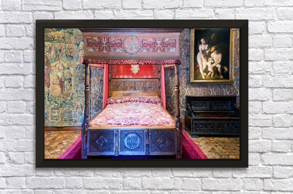 A wooden bed with intricate carvings is displayed in a room at the Chateau de Chenonceau in France surrounded by tapestries and art.