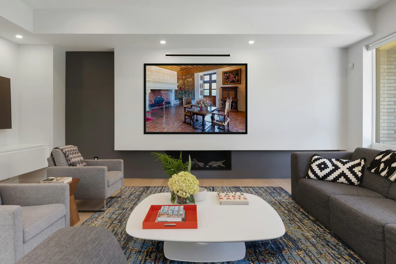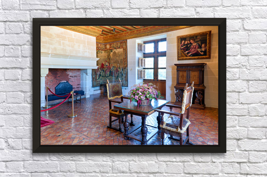 Visitors can see the interior of Chateau de Chenonceau showcasing furniture artwork and a tapestry. Sunlight fills the room through the windows.