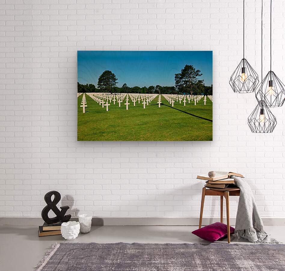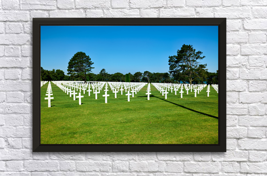 Grave markers stand in rows at the Normandy American Cemetery in Colleville sur Mer. This site honors fallen soldiers from World War II.
