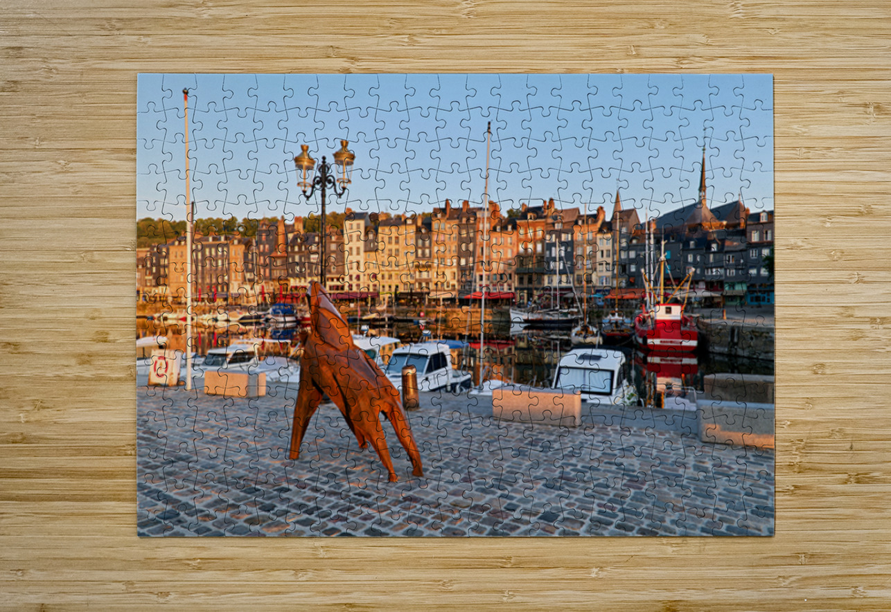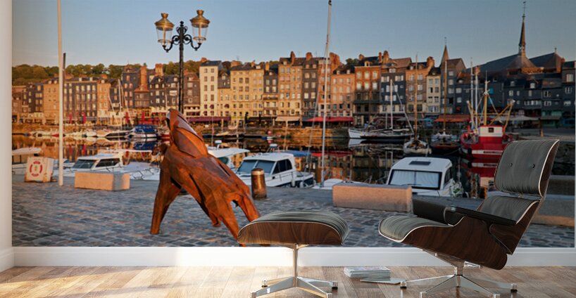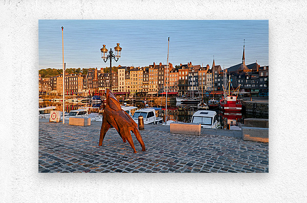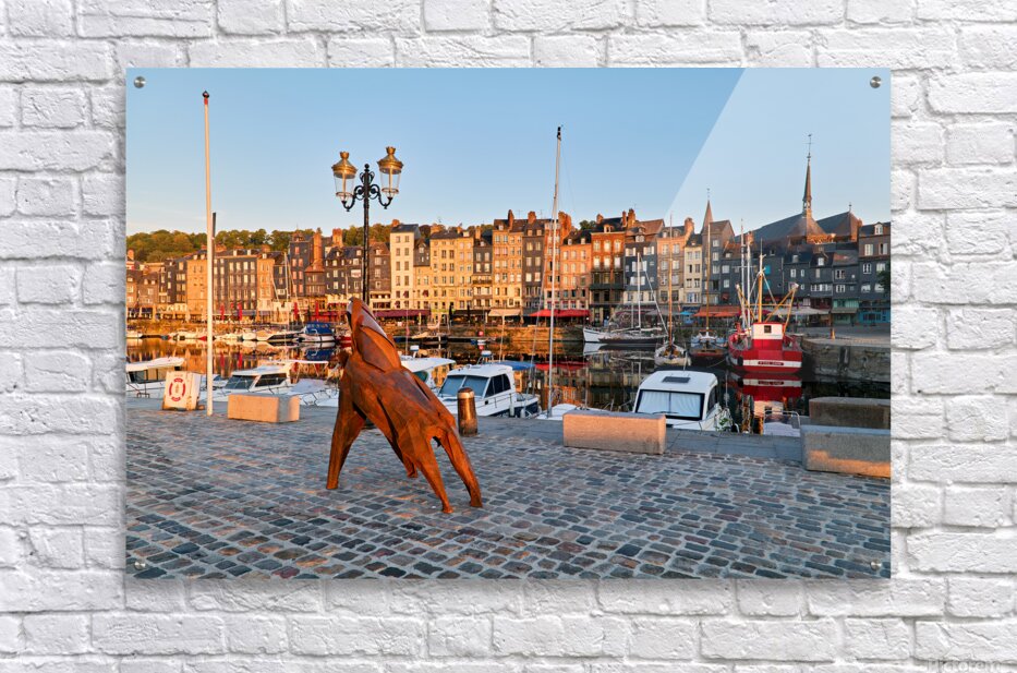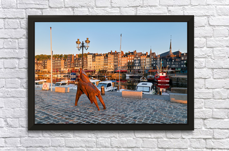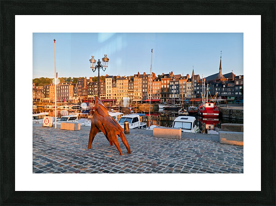 Boats are docked in the harbour at Honfleur. The sun rises casting light on buildings. A sculpture stands by the water.