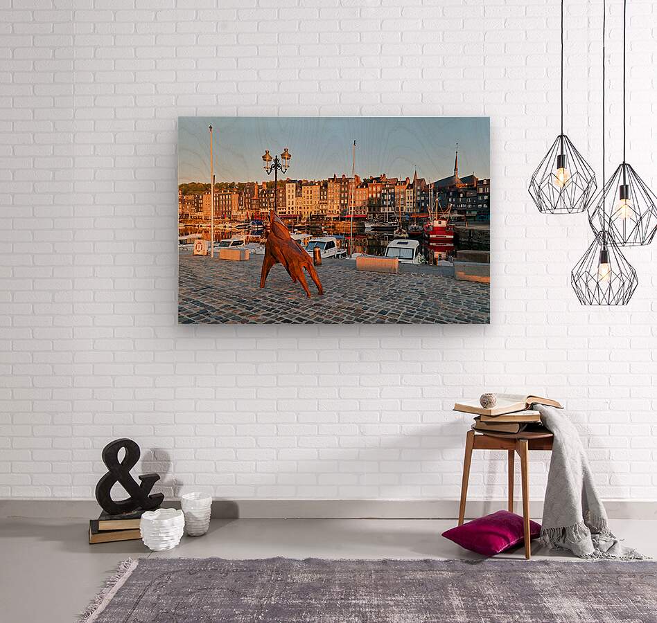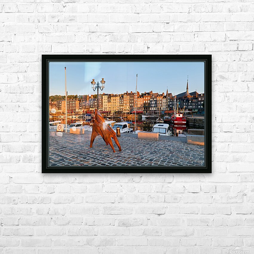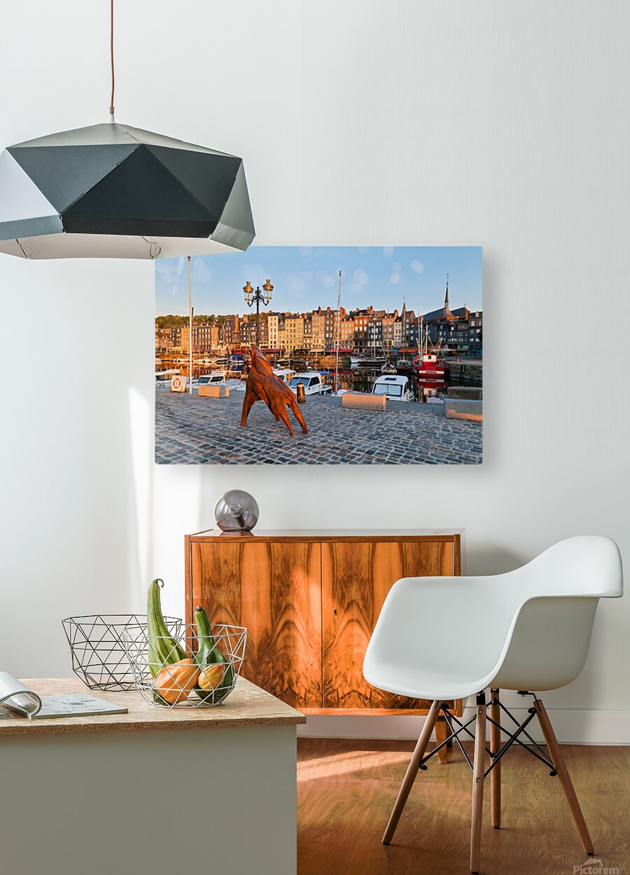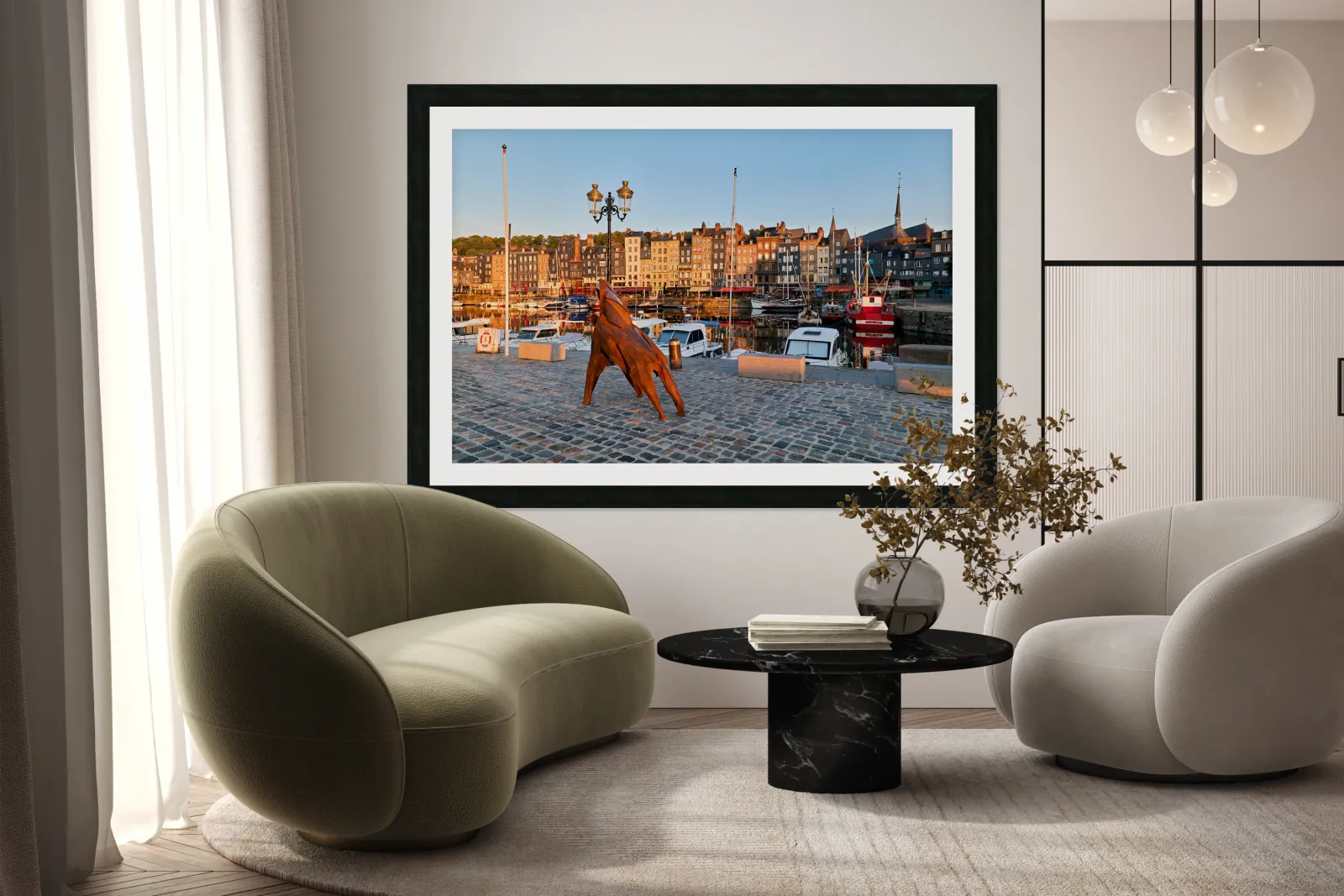 Boats are docked in the harbour at Honfleur. The sun rises casting light on buildings. A sculpture stands by the water.