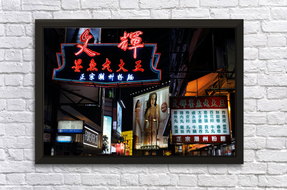 Neon signs for various businesses shine in the night as people walk on a busy Hong Kong street filled with life and energy.