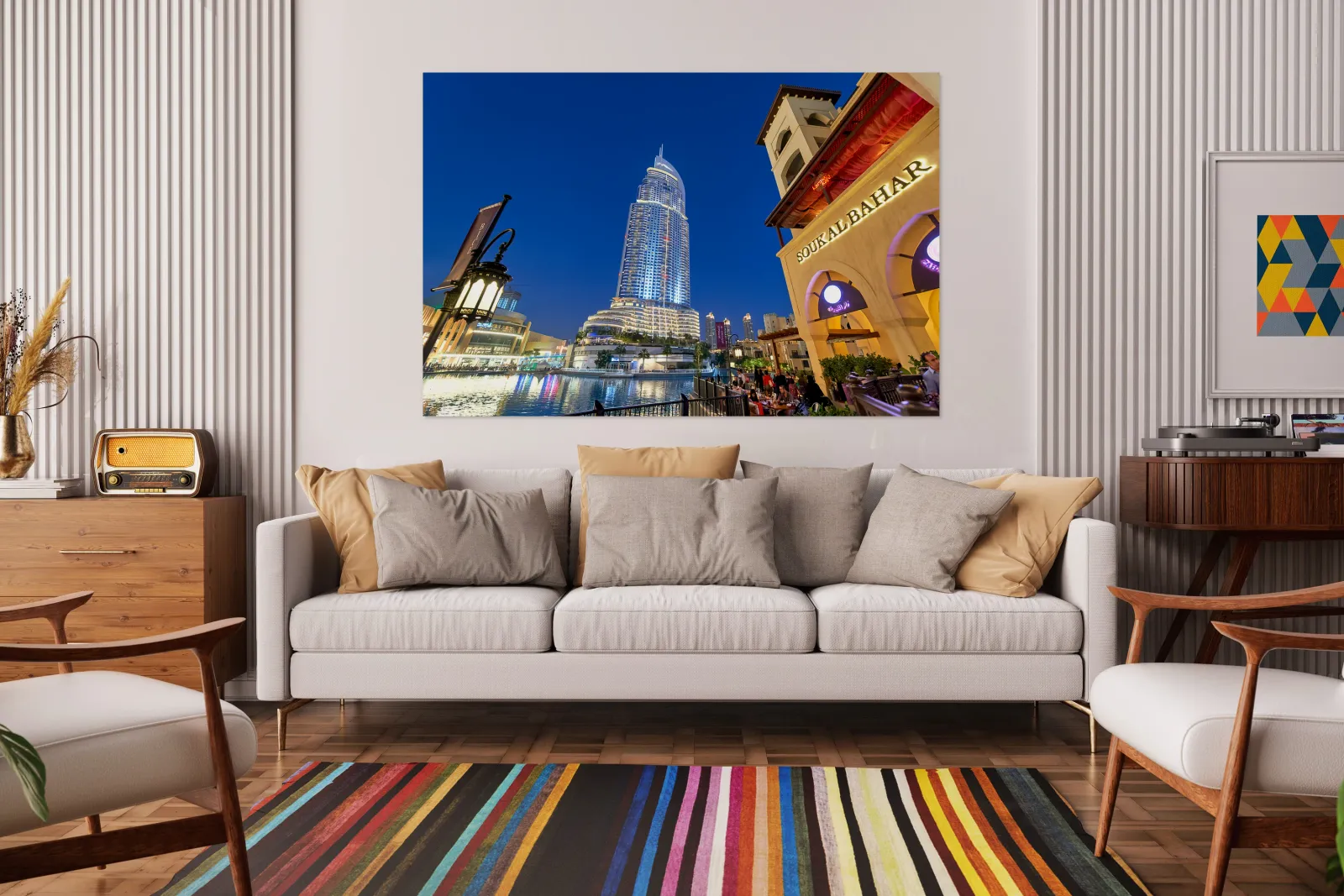 Dubai showcases its bright city lights at night with people dining by the water. The tall buildings reflect on the calm water.