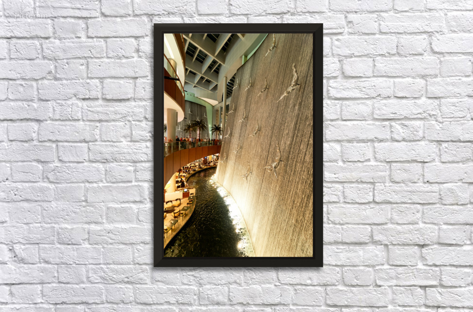 Visitors enjoy dining near an indoor waterfall with diving sculptures at a popular location in Dubai.