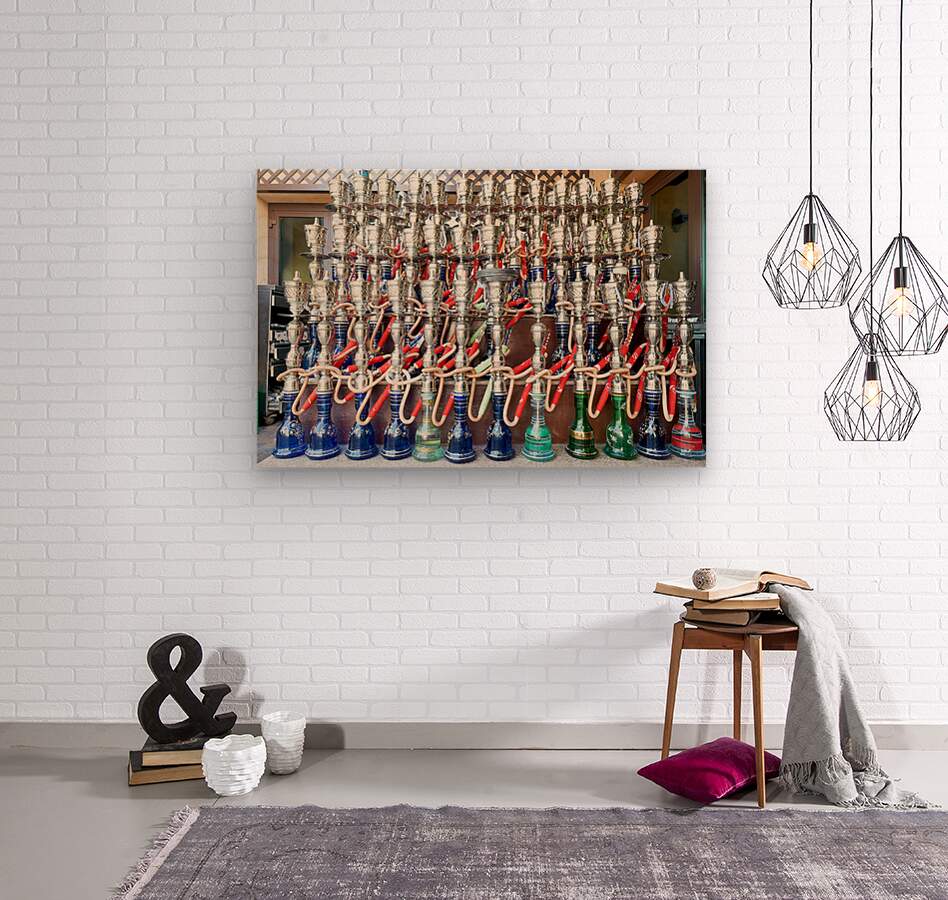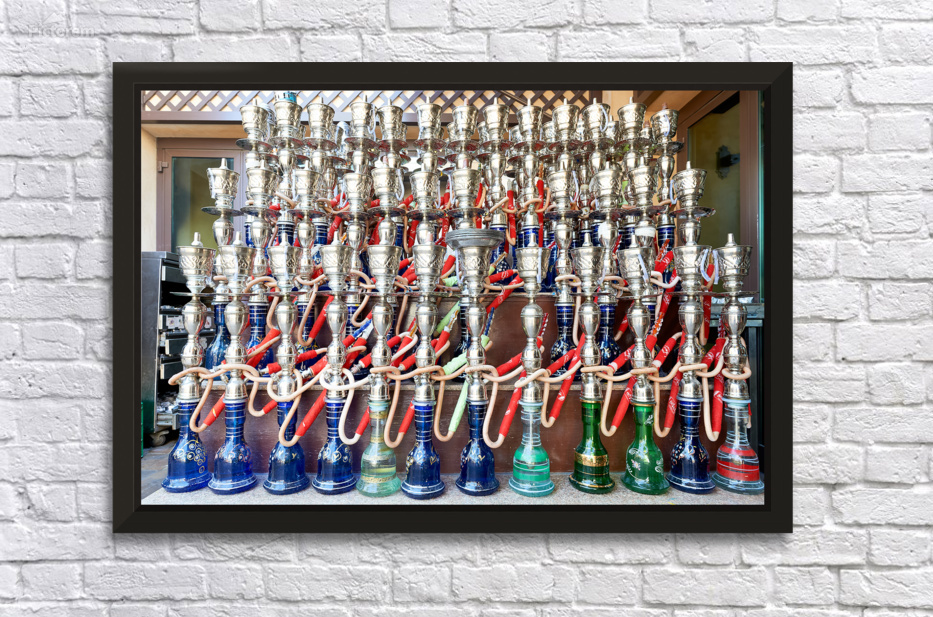 A Dubai cafe offers a variety of traditional hookahs for sale. The display shows many colorful designs and styles.