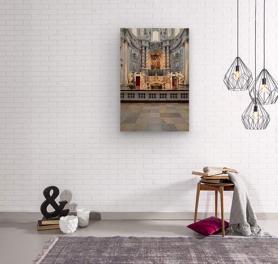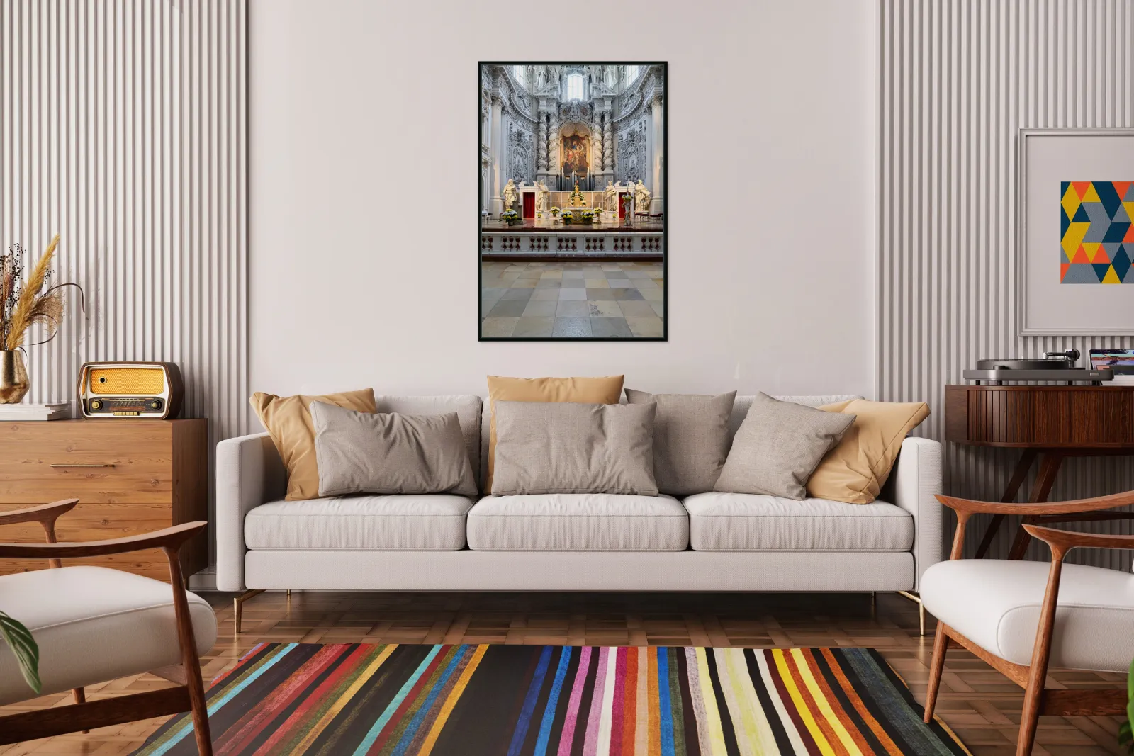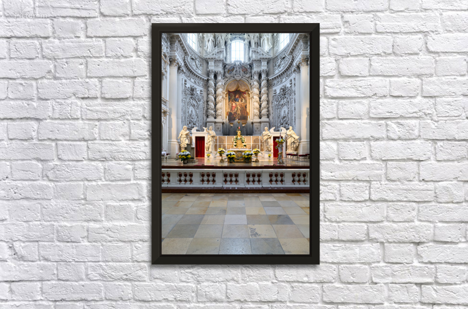 Inside Theatinerkirche in Munich the altar area is filled with sculptures and flowers. Light enters through large windows.