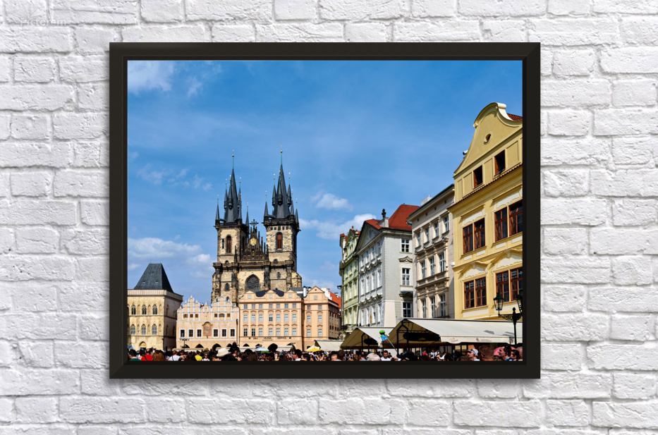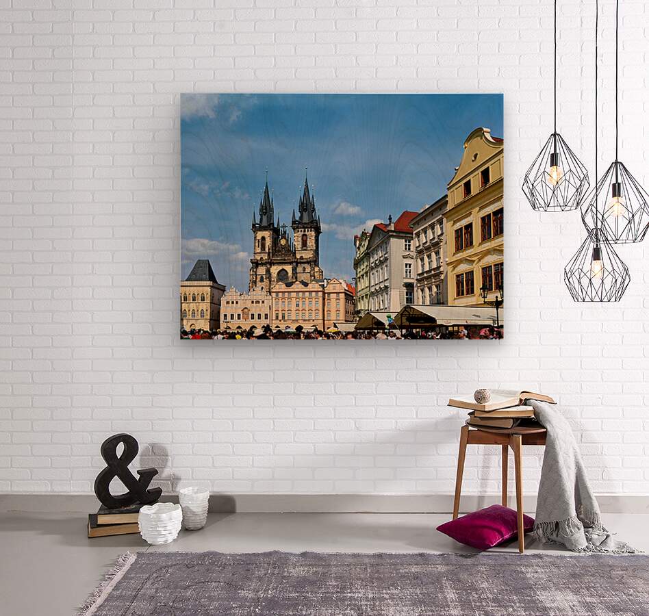 Tourists and locals gather in Pragues Old Town Square enjoying the historic architecture including the Church of Our Lady before Týn on a sunny day.