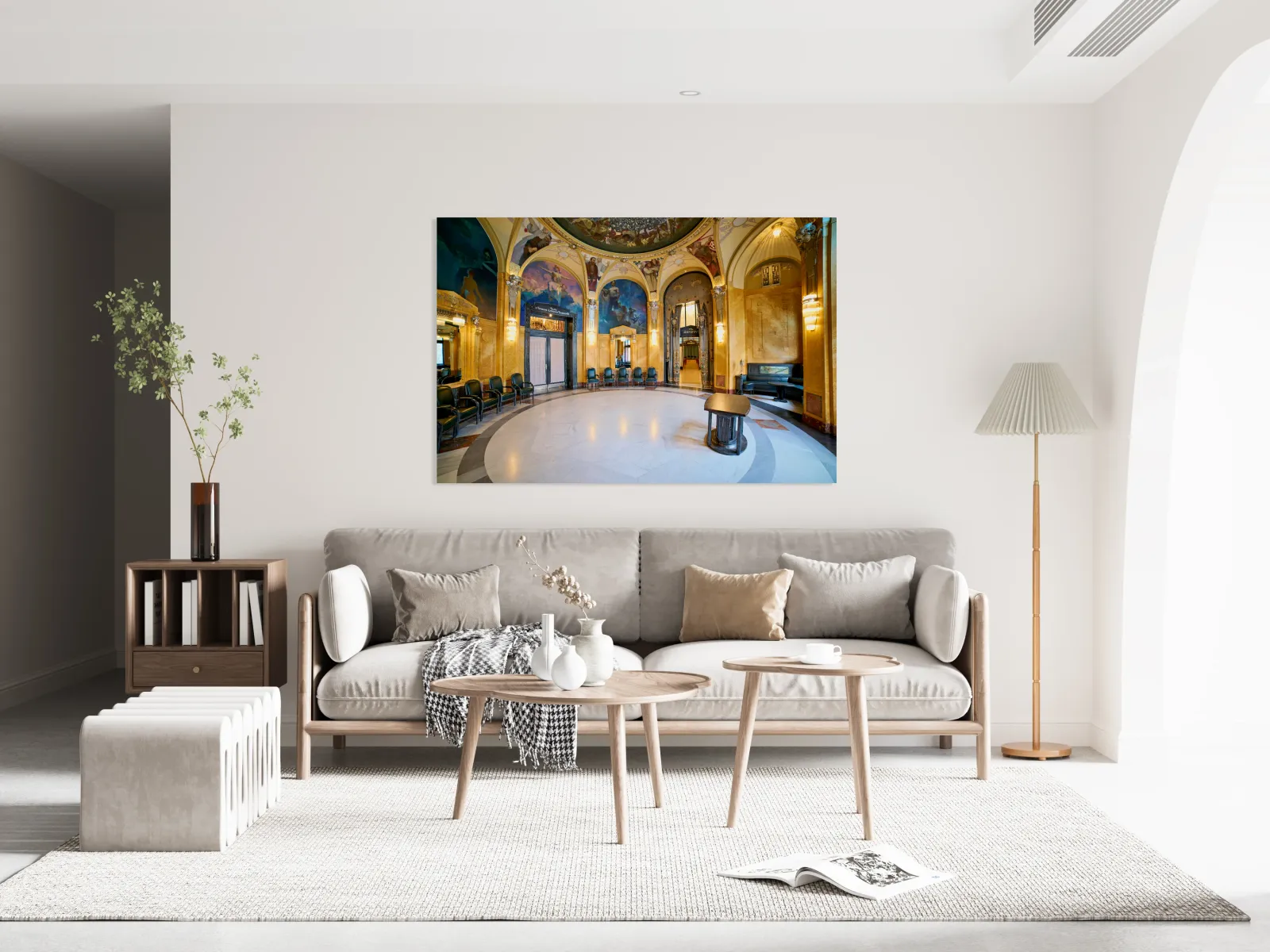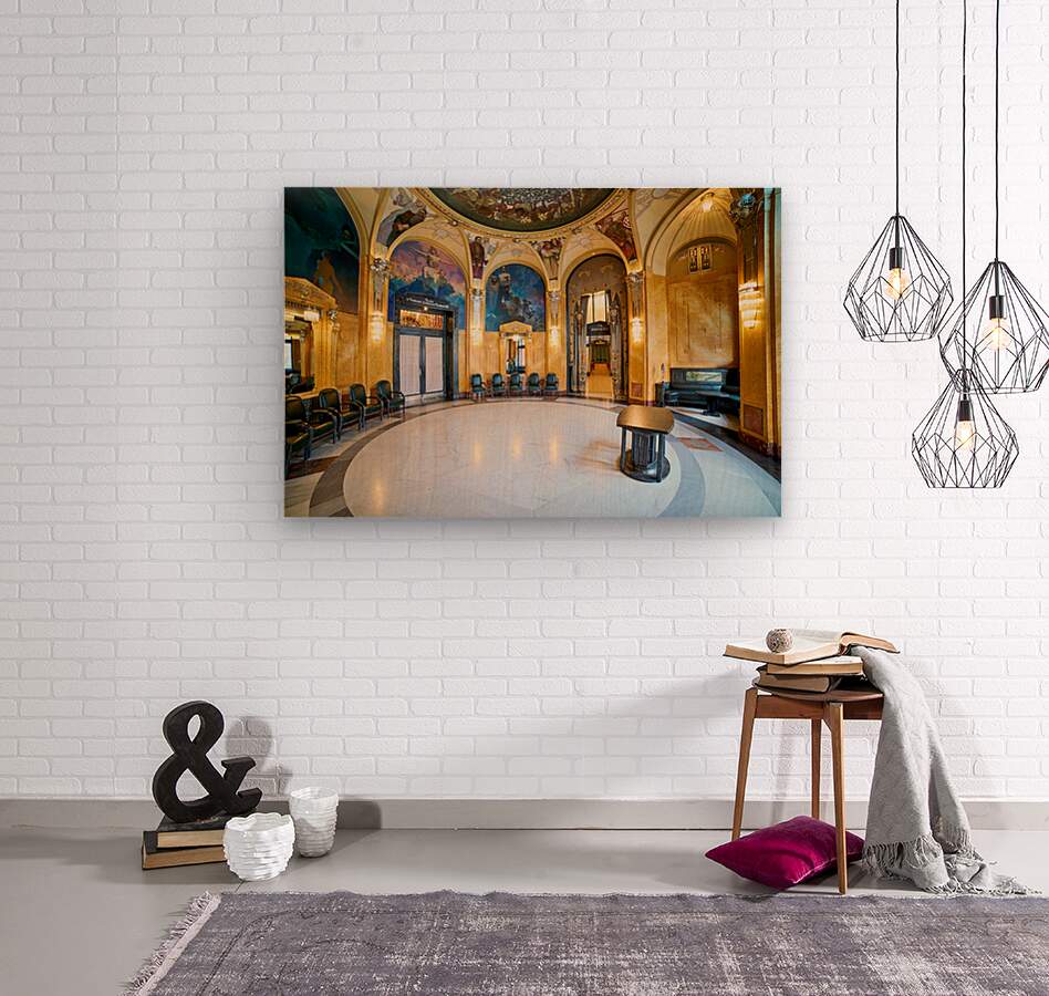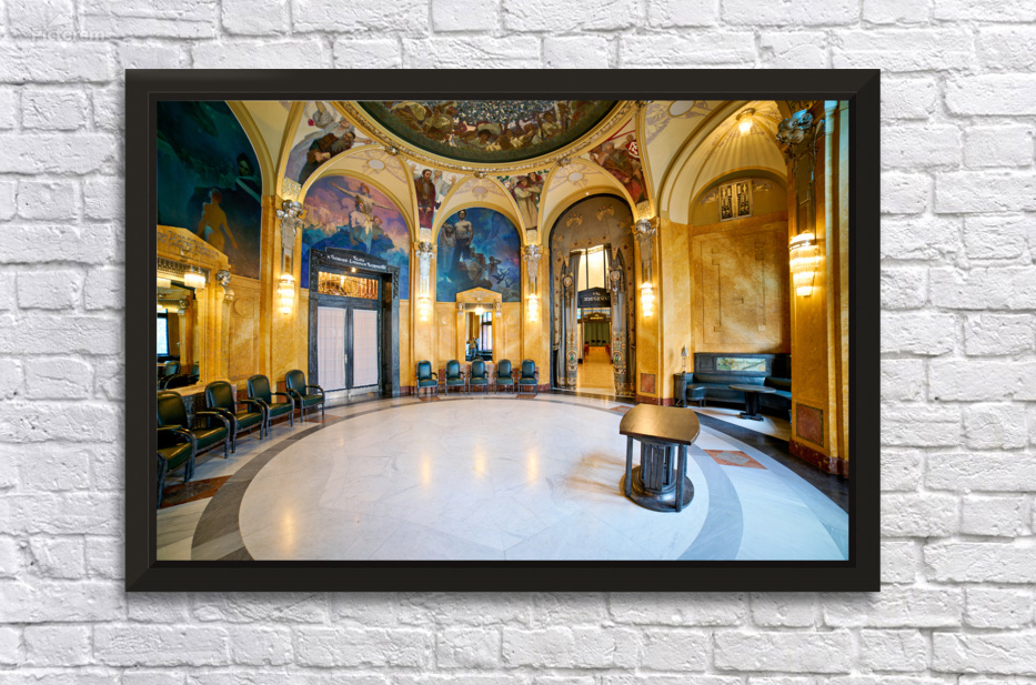 "Ornate historic hall with murals arches and elegant seating." dans une impression encadrée.