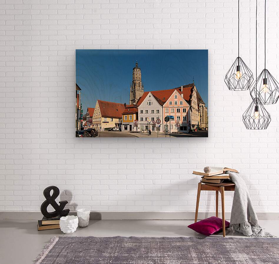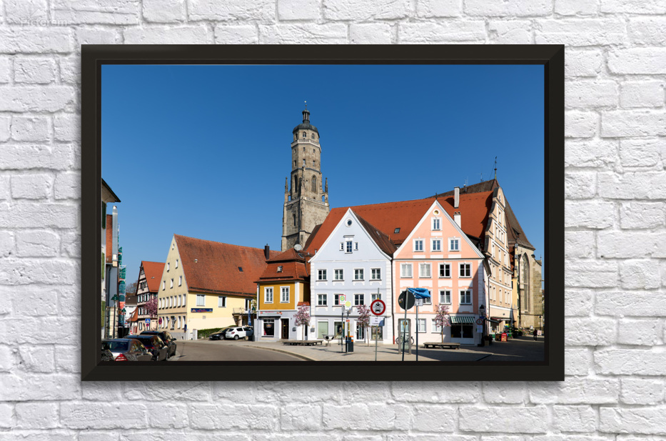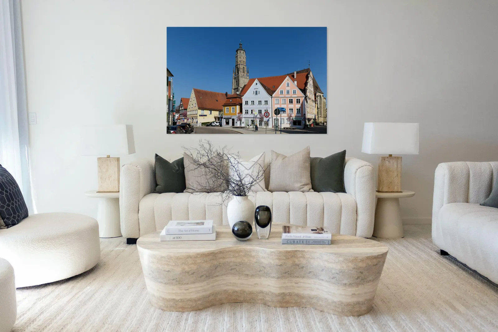 Nordlingen shows its buildings and landmarks under a clear blue sky. Visitors can walk around the town and admire the architecture.