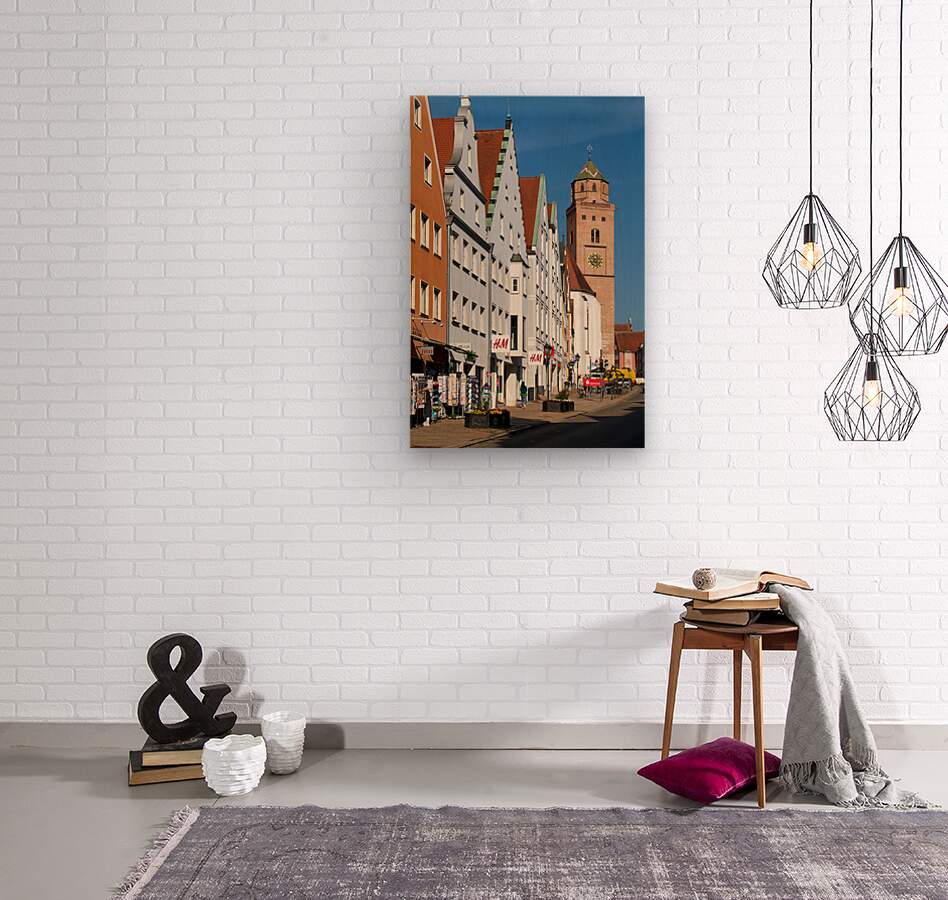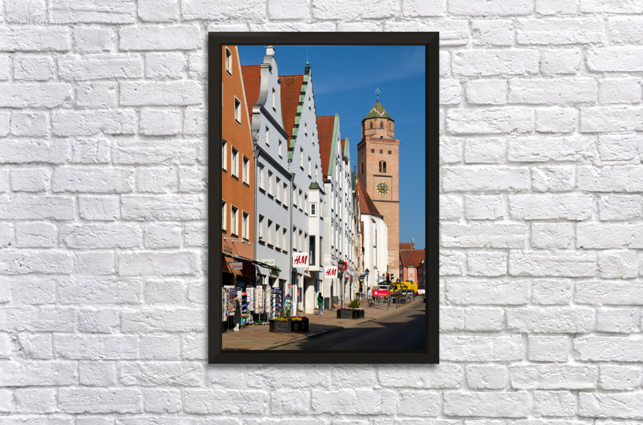 Visitors walk along the main street in Donauworth. The Liebfrauenmünster church stands tall in the background under a clear blue sky.