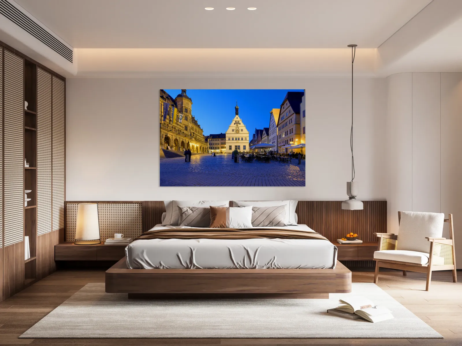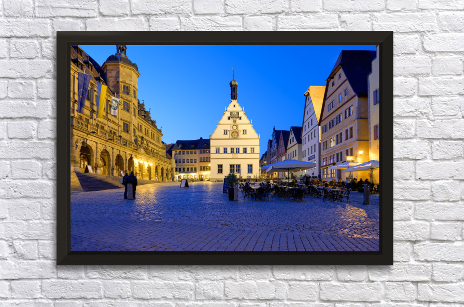Market square in Rothenburg ob der Tauber shows the town hall at sunset with people enjoying the setting in Bavaria along the Romantic Road.