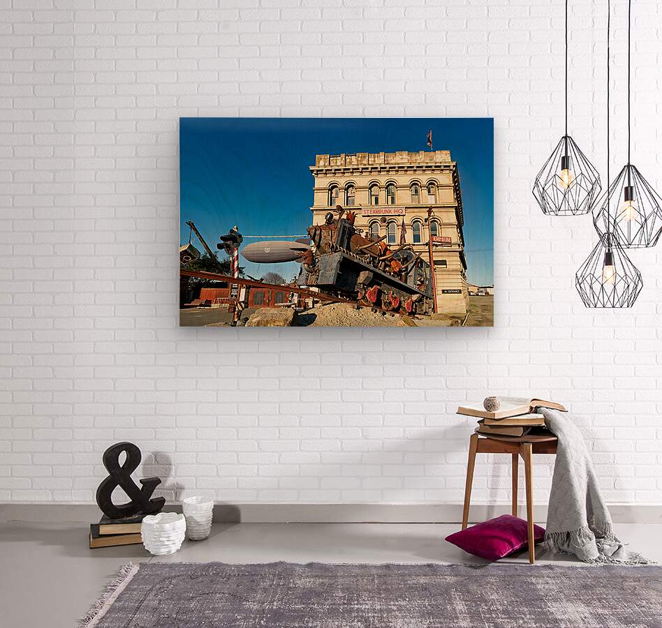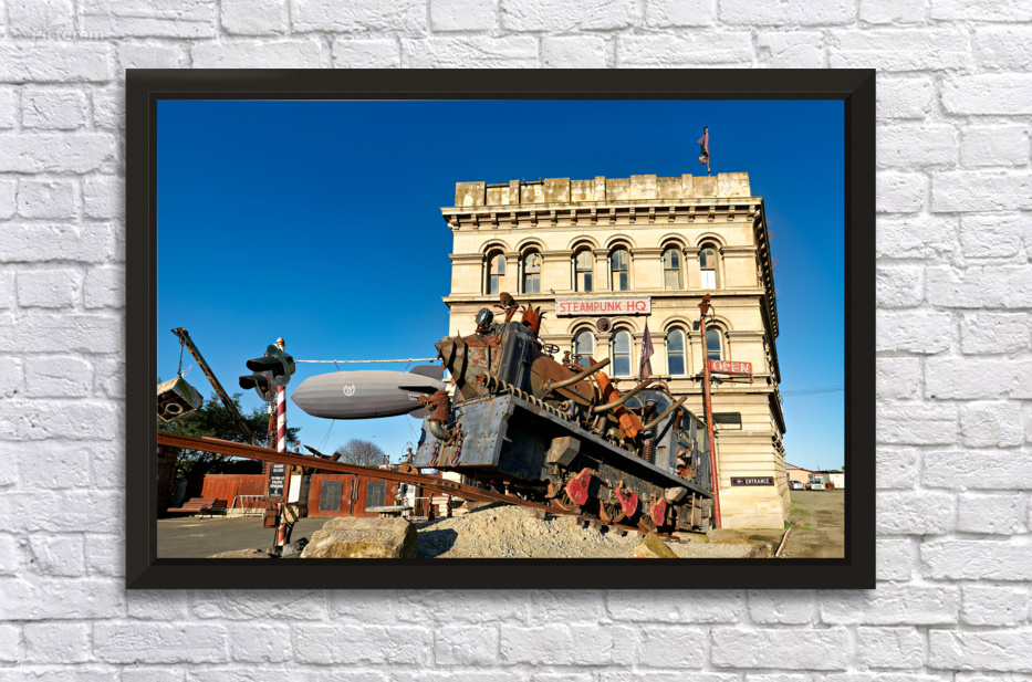 Visitors explore the Steampunk Engine at Steampunk HQ in Oamaru New Zealand. Unique art pieces and inventions draw attention.