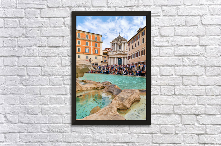 People gather around Trevi Fountain in Rome to toss coins take photos and enjoy the lively setting with historic buildings nearby.