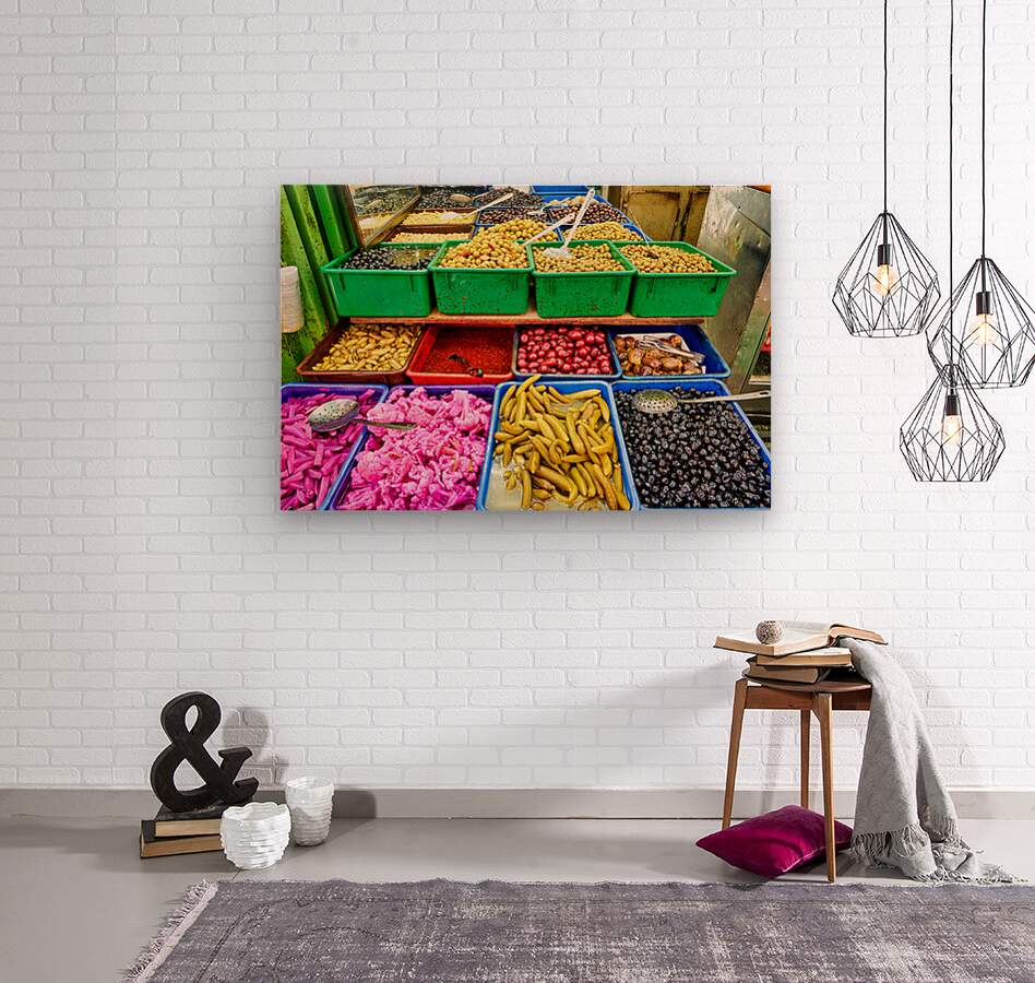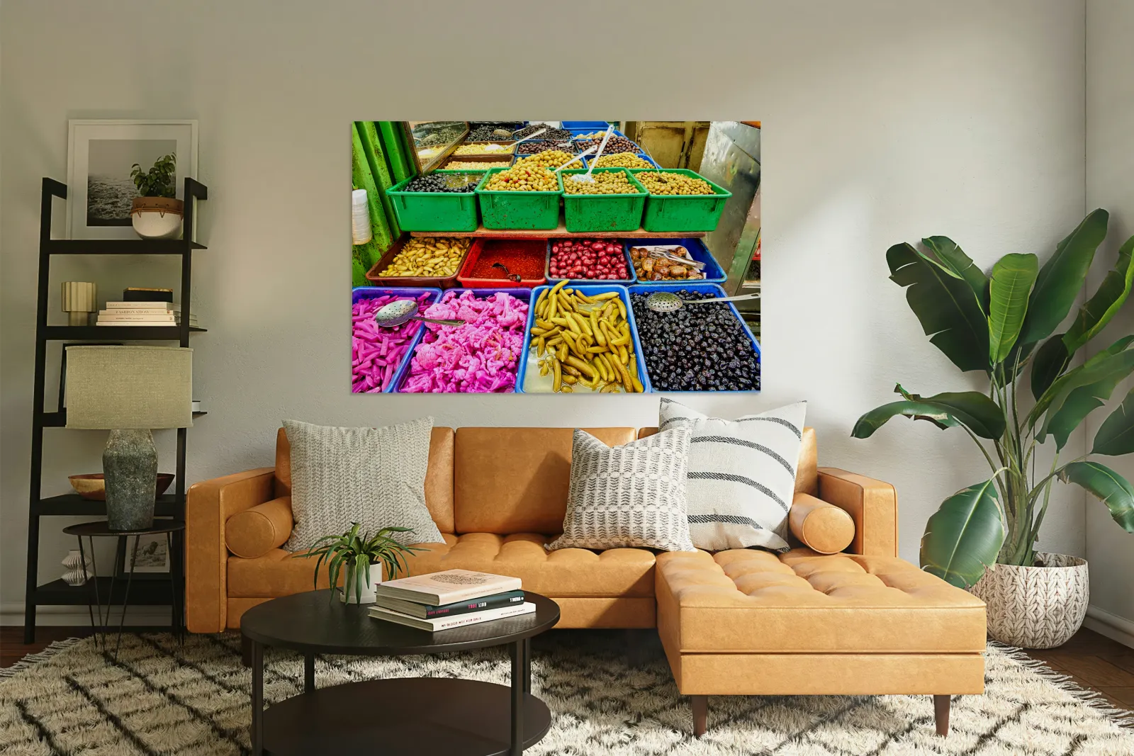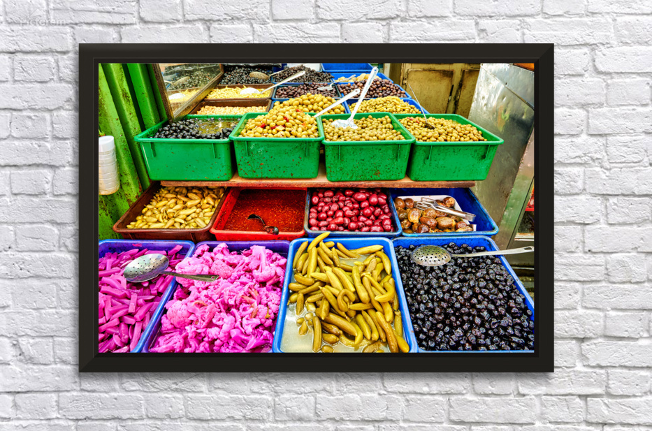"Pickles and olives for sale in market in old city of Jerusalem" dans une impression encadrée.