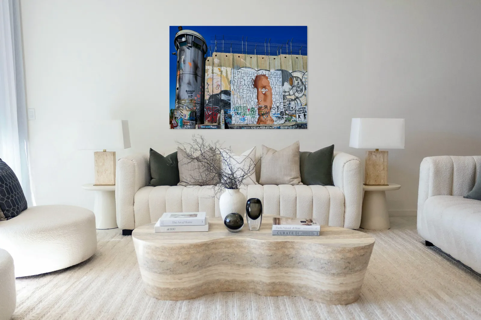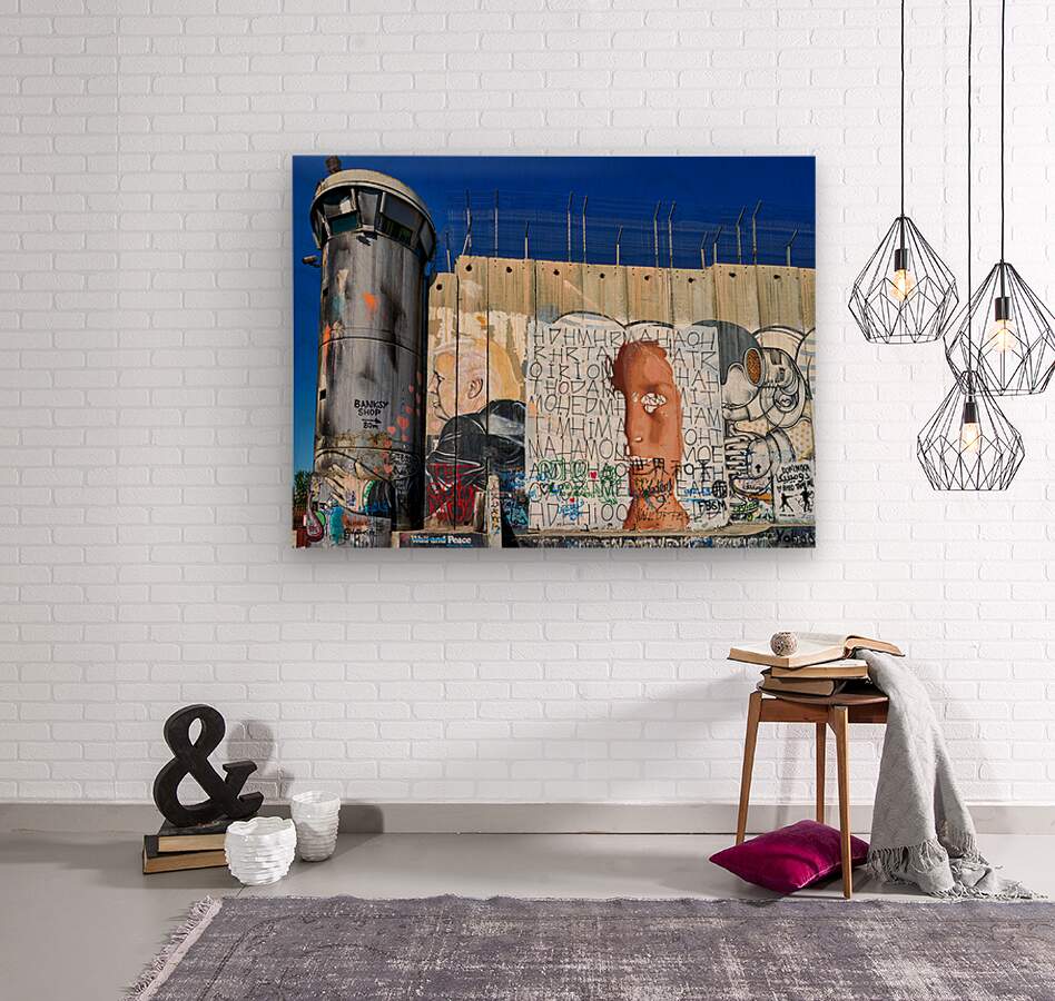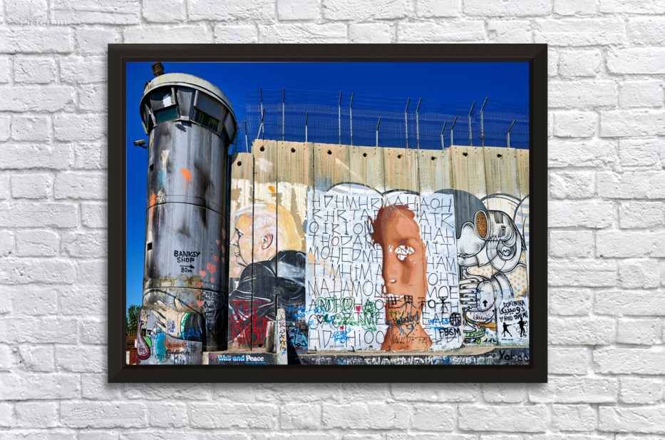 A large separation wall stands in Bethlehem with graffiti art and a guard tower. The sky is clear showing the contrast between the wall and art.