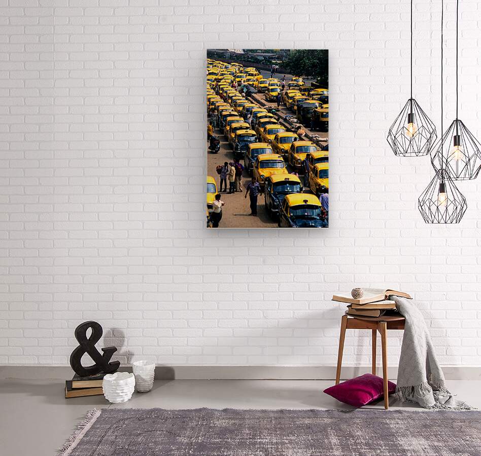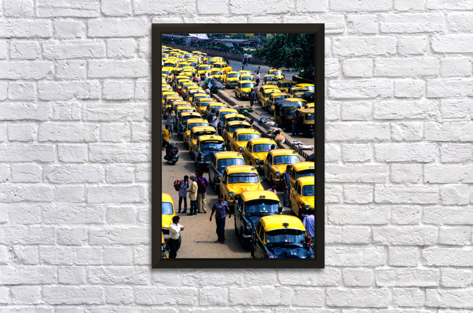 Many yellow taxis are parked closely together in Kolkata. People walk among the taxis in a busy urban area.