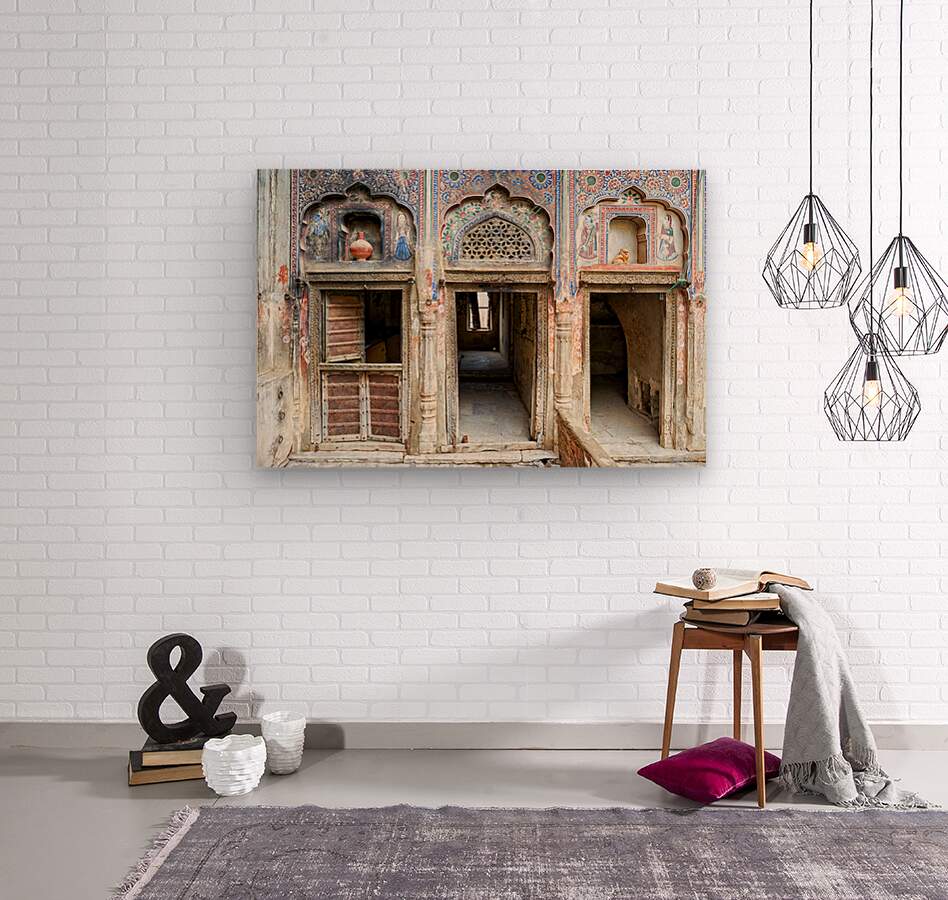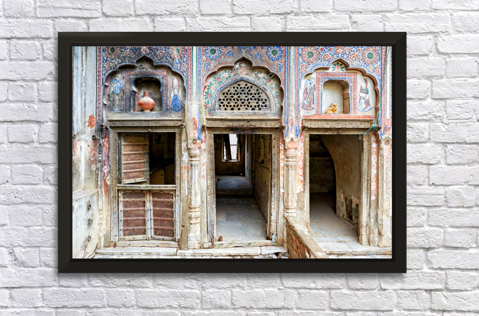 The traditional design of a house in Mandawa Rajasthan. The walls are decorated with patterns and colors typical of the region.