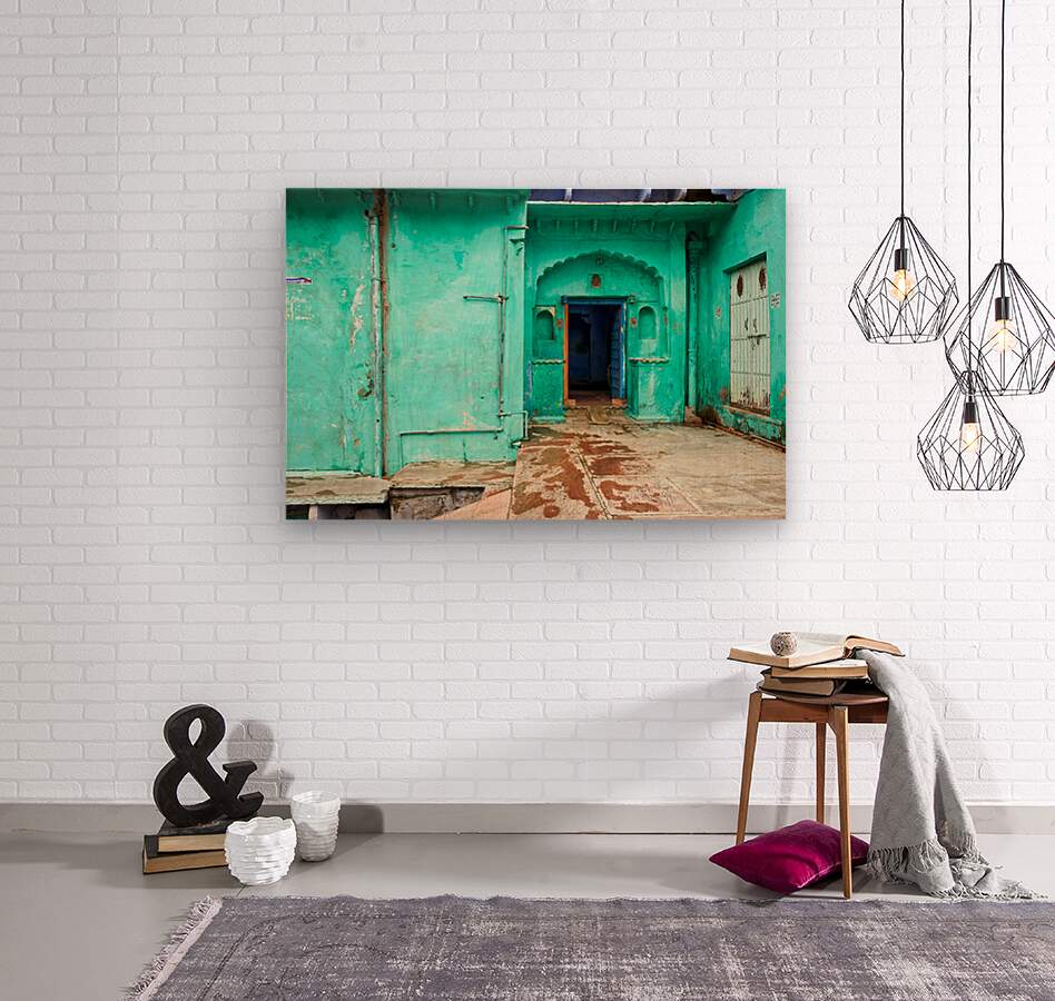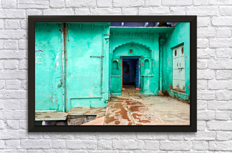 A painted house stands in Bundi Rajasthan. The blue door and green walls attract attention in the busy street scene.