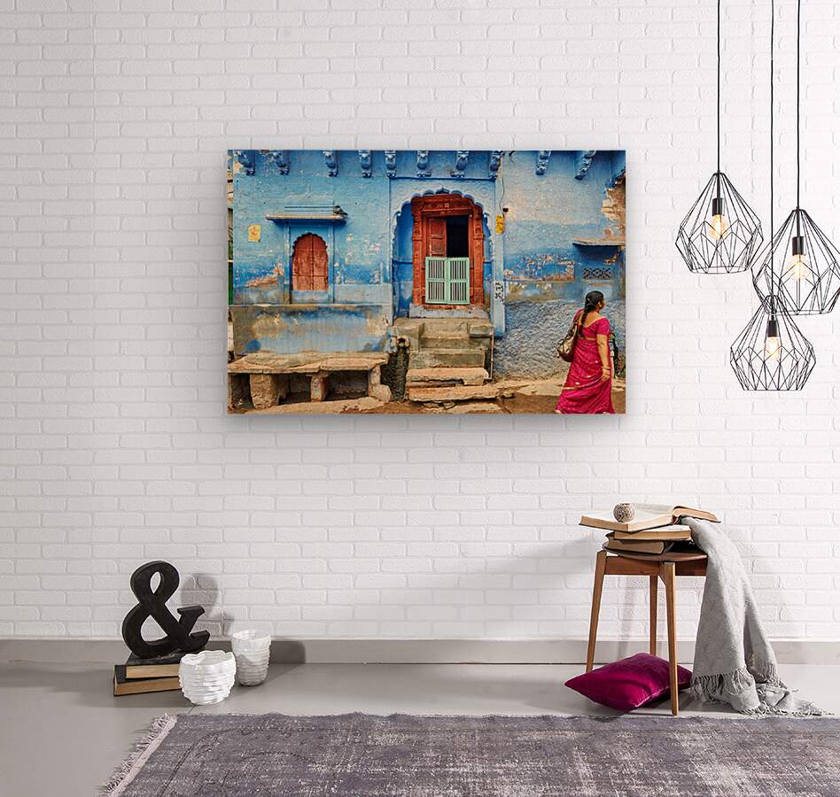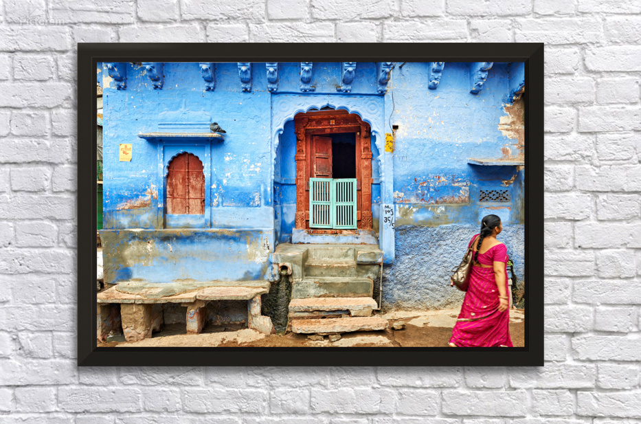 "Walking along the blue streets of Jodhpur in Rajasthan India" dans une impression encadrée.