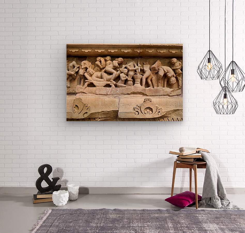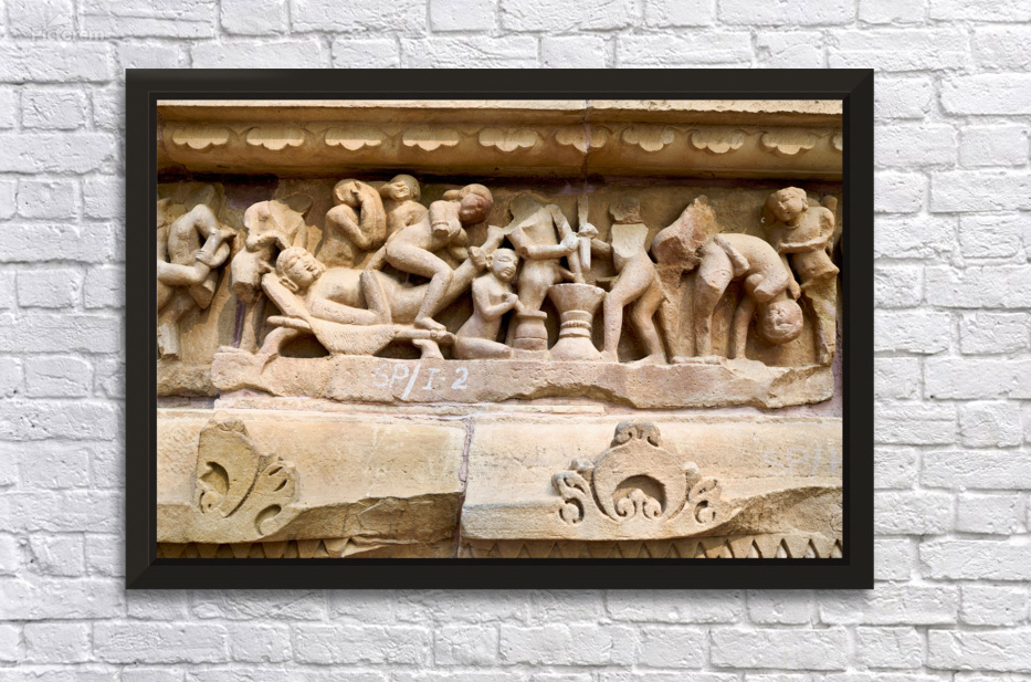 Carvings on the stone wall show people engaging in various activities and rituals in Khajuraho Madhya Pradesh India.