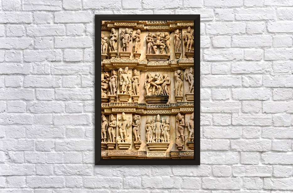 Visitors observe detailed carvings on ancient Hindu temples in Khajuraho Madhya Pradesh. The art depicts various aspects of life and love.