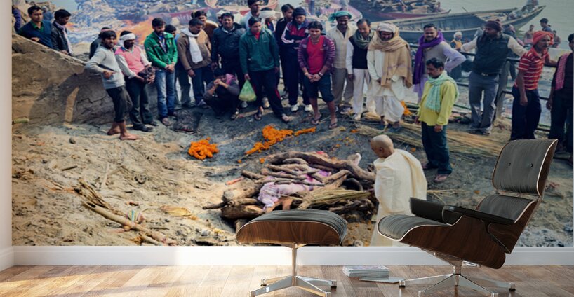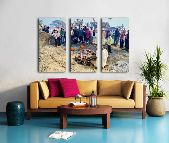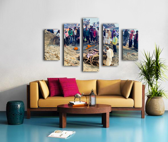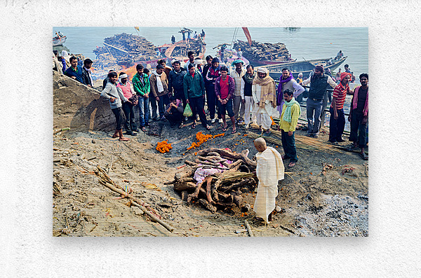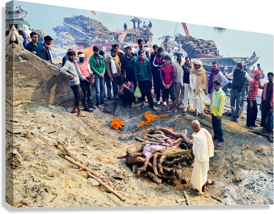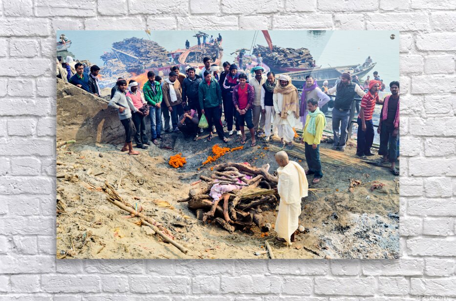 SUR CETTE OEUVRE: CREMATION RITES BY THE GANGES RIVER IN VARANASI INDIA