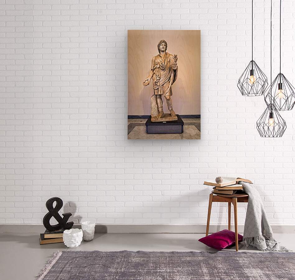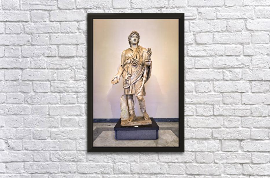 A Roman statue stands in the National Archaeological Museum of Naples. The figure holds a ball in one hand and a bundle of plants in the other.