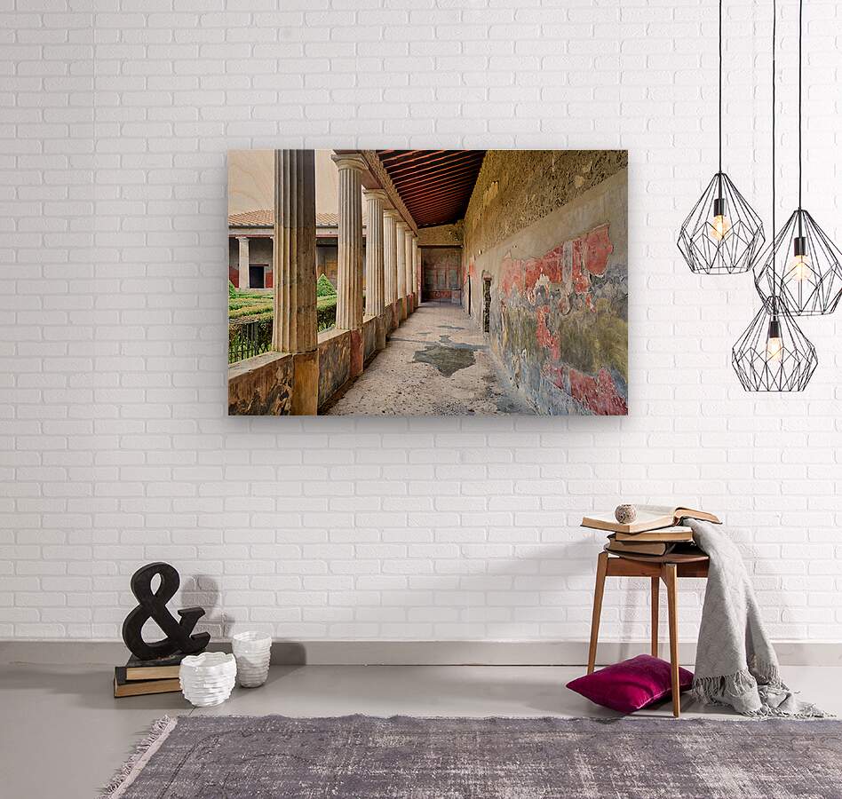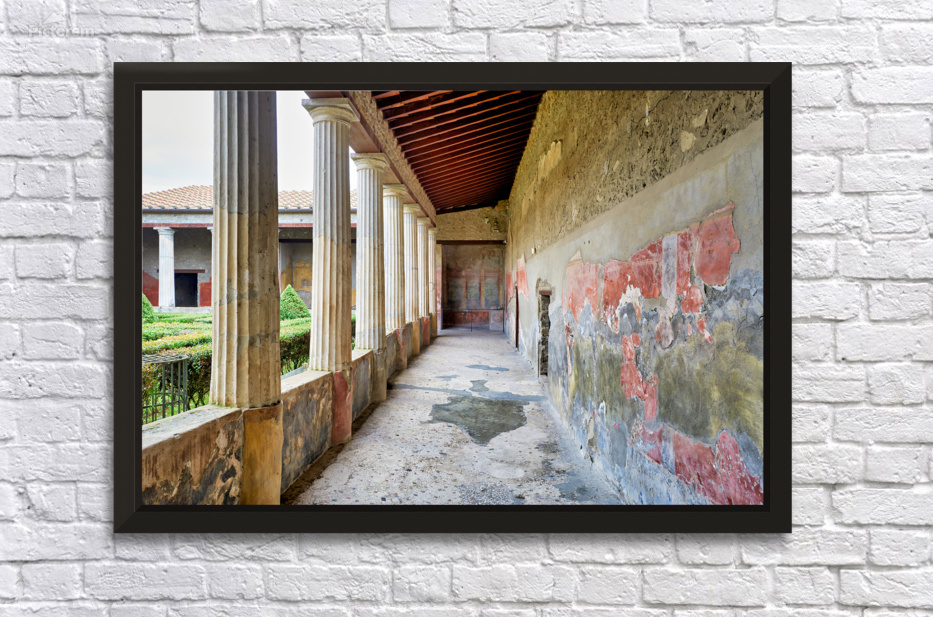 Visitors walk through a corridor lined with ancient columns in Pompeii Naples. The walls show signs of age and past artwork.