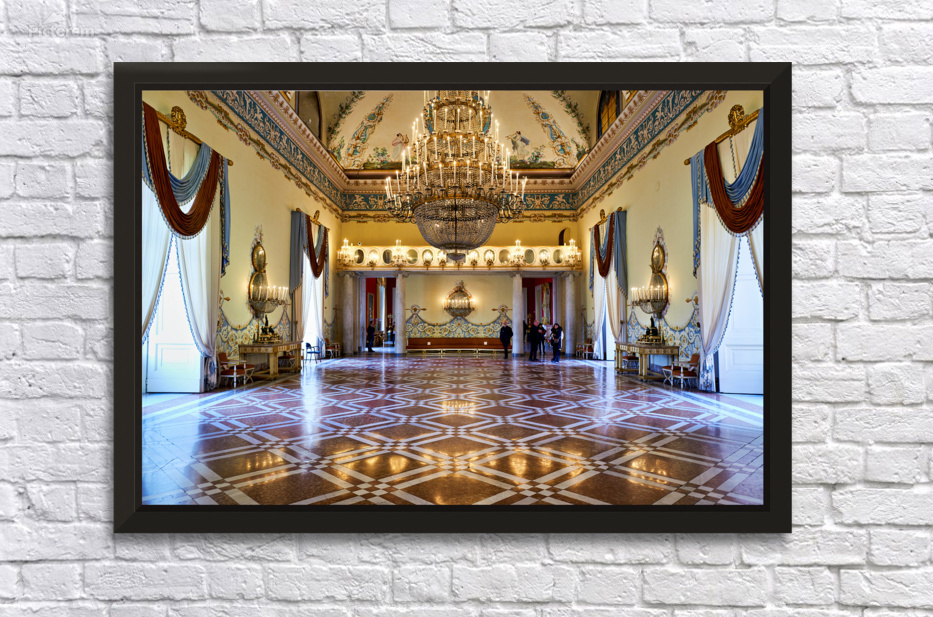 Visitors walk through the large hall of Museo di Capodimonte in Naples. The space features a grand chandelier and elegant decor.
