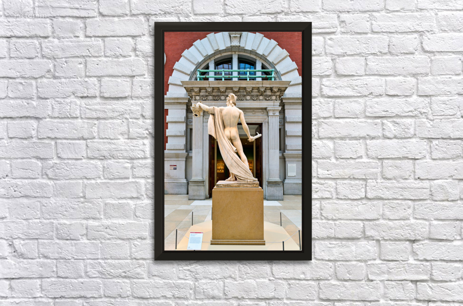 Perseus stands holding the head of Medusa outside the Greek and Roman section of the Metropolitan Museum of Art in New York.